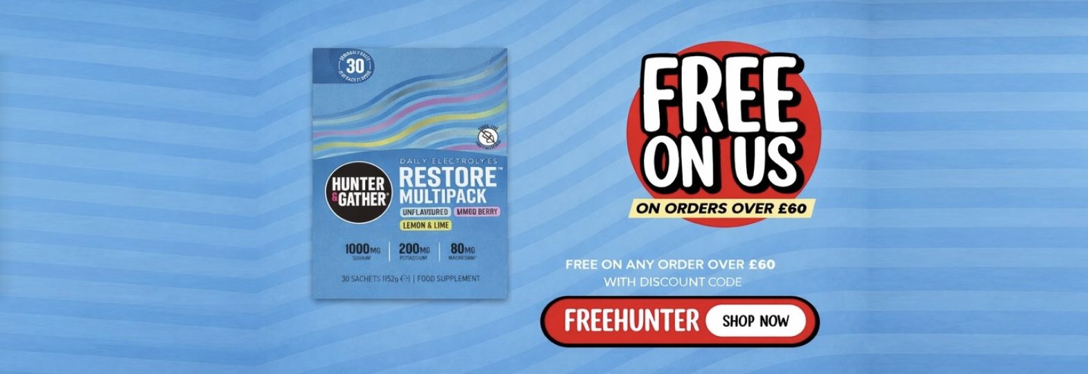 Best Before Date: 30-09-2026Hunter & Gather Restore Electrolytes – Lemon & Lime | 30 x 5.6g Sachets | No Added Sugar | Keto | Natural Hydration