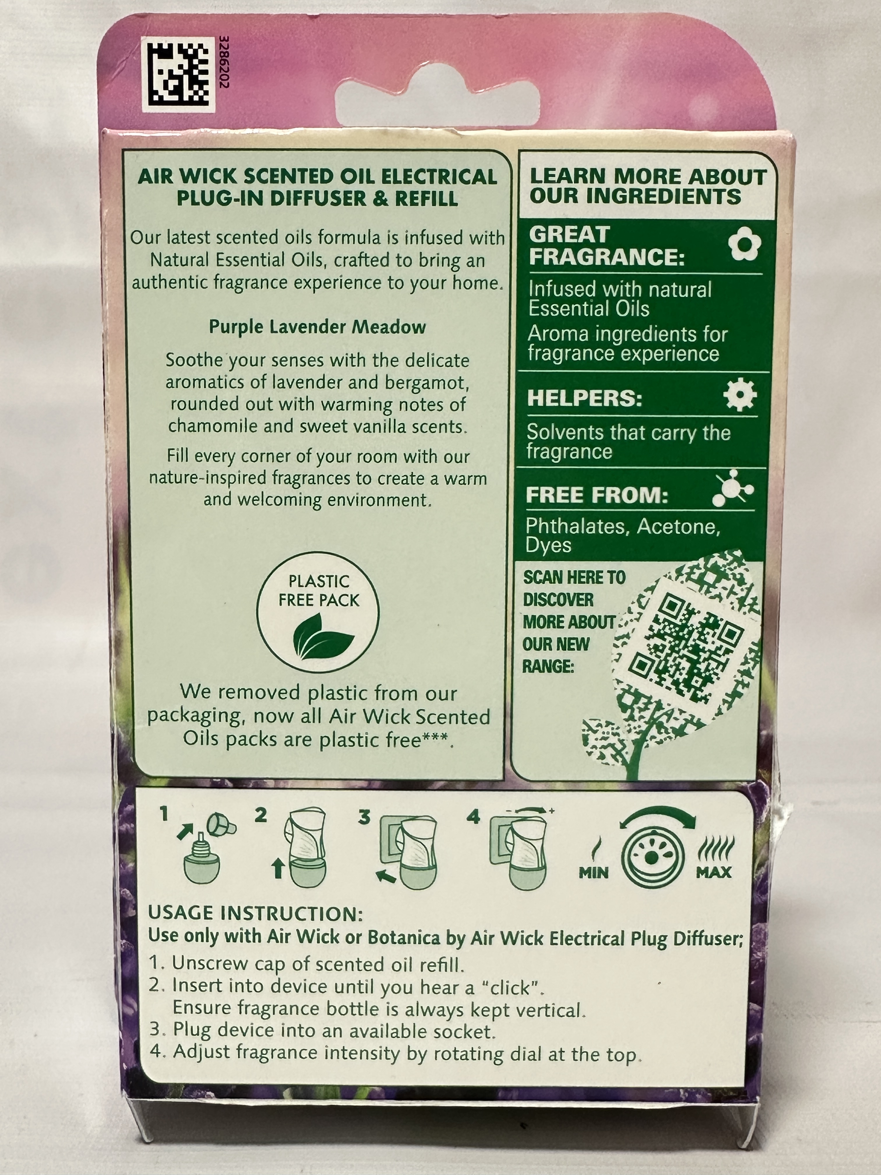 Transform your home into a calming oasis with Air Wick Essential Oils Plug In & Refill – Purple Lavender Meadow. Infused with natural essential oils, this fragrance gently releases the soothing scent of lavender and bergamot, blended with comforting notes of chamomile and sweet vanilla.