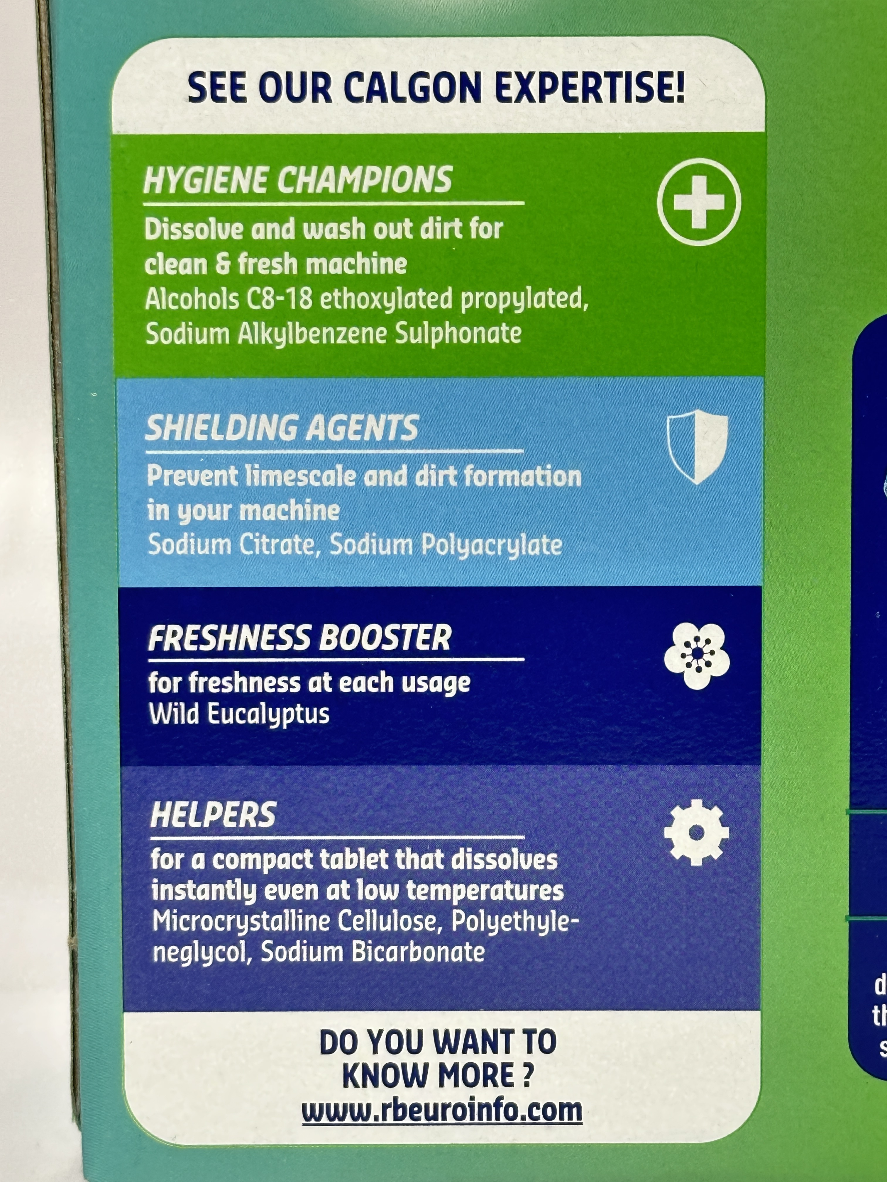 Calgon Hygiene Plus tablets are designed to help maintain your washing machine by reducing limescale build-up, detergent residue, and unwanted odours. Suitable for regular use, these water softener and machine care tablets support cleaner internal components, helping your appliance run efficiently over time. The Wild Eucalyptus variant provides a fresh, clean scent while being compatible with all washing machine types.