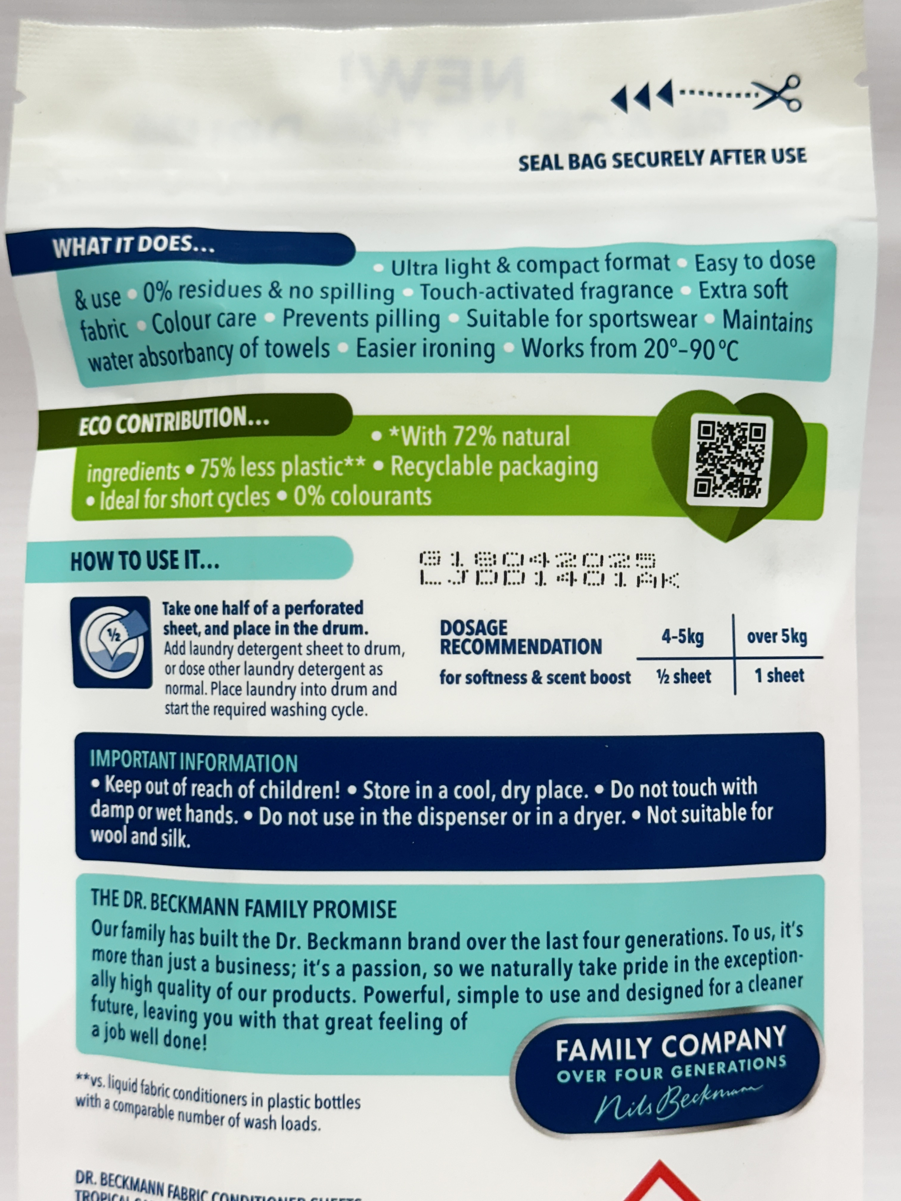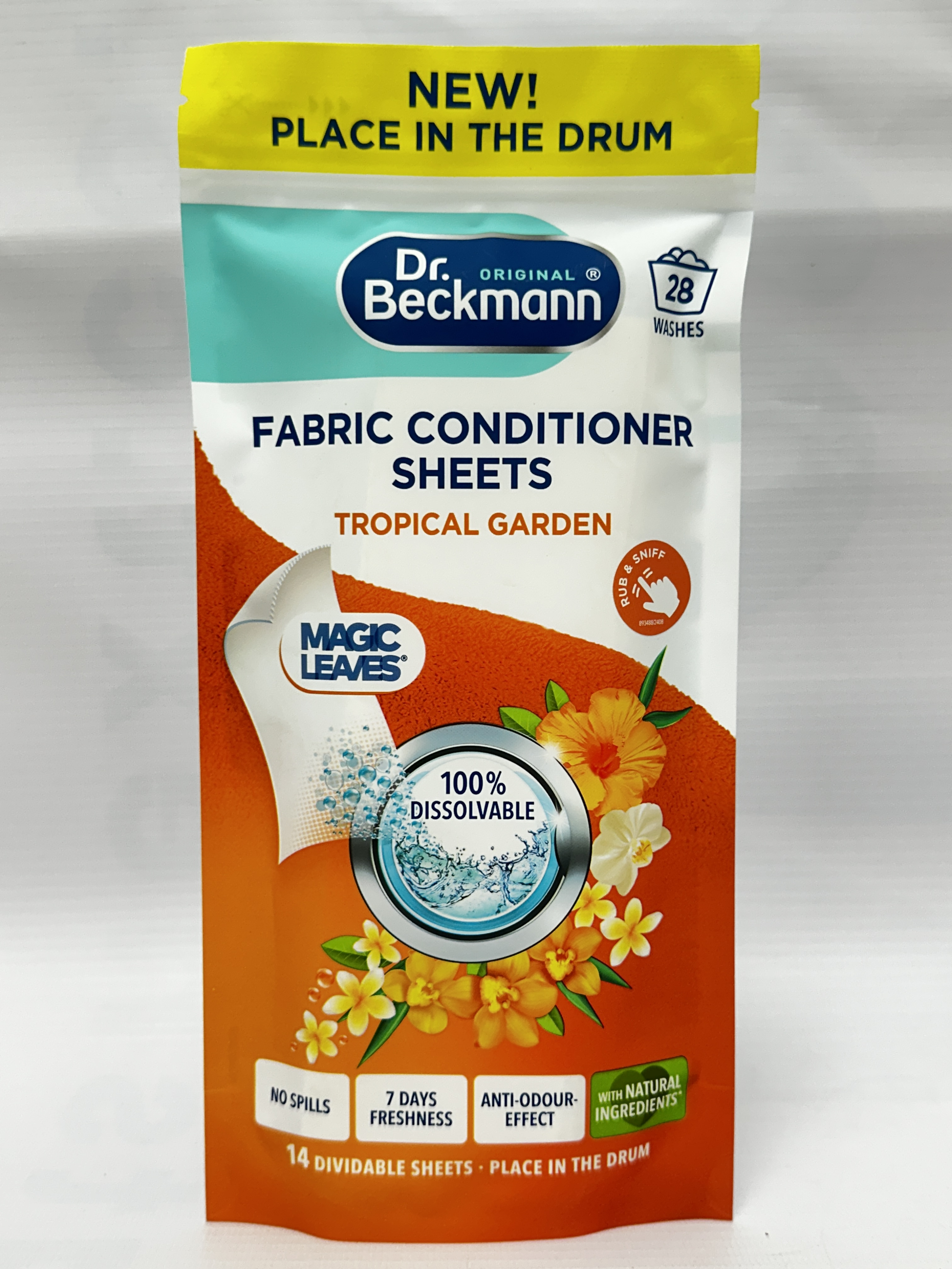 Dr. Beckmann Fabric Conditioner Sheets Tropical Garden are a convenient pre-dosed alternative to traditional liquid fabric conditioner. This pack contains 14 dividable sheets and is designed to be placed directly in the drum, helping make laundry care simple, practical and less messy.