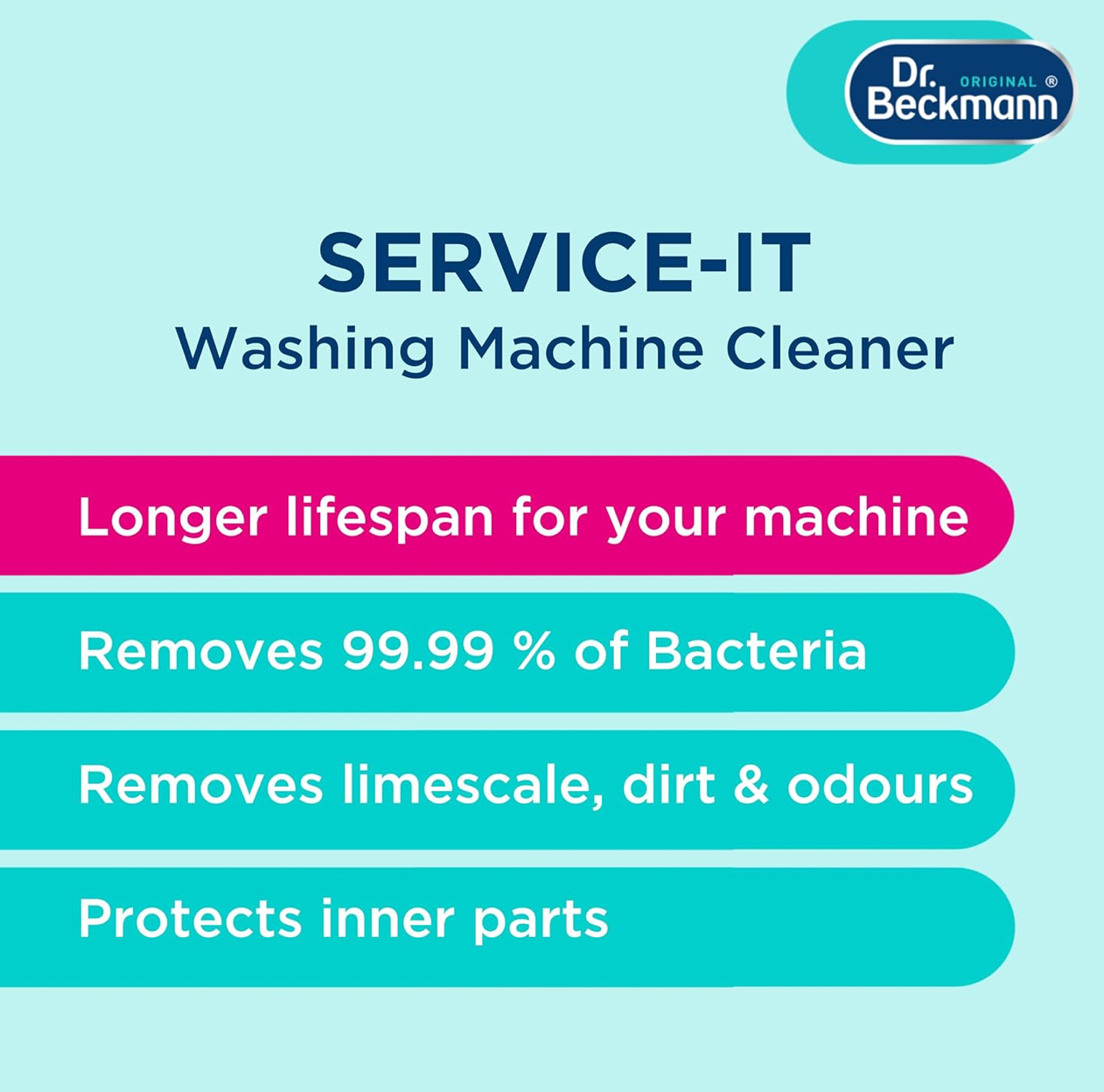 Dr. Beckmann Service-It Washing Machine Cleaner is specially formulated to clean, freshen, and maintain your washing machine for optimal performance. This powerful 250ml liquid solution targets the hidden buildup of limescale, detergent residue, and dirt that accumulates in hard-to-reach areas such as the drum, pipes, and rubber seals.
