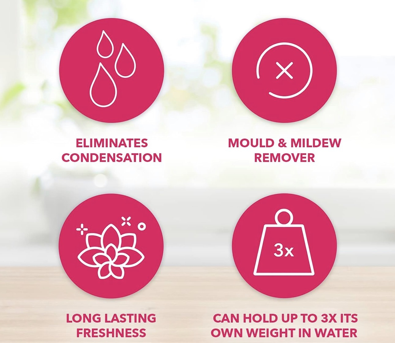 Each tub is designed to absorb moisture from the air and leave behind a Fresh Linen fragrance. The multipack format is ideal for placing in several rooms at once or for keeping replacement tubs ready in the cupboard.