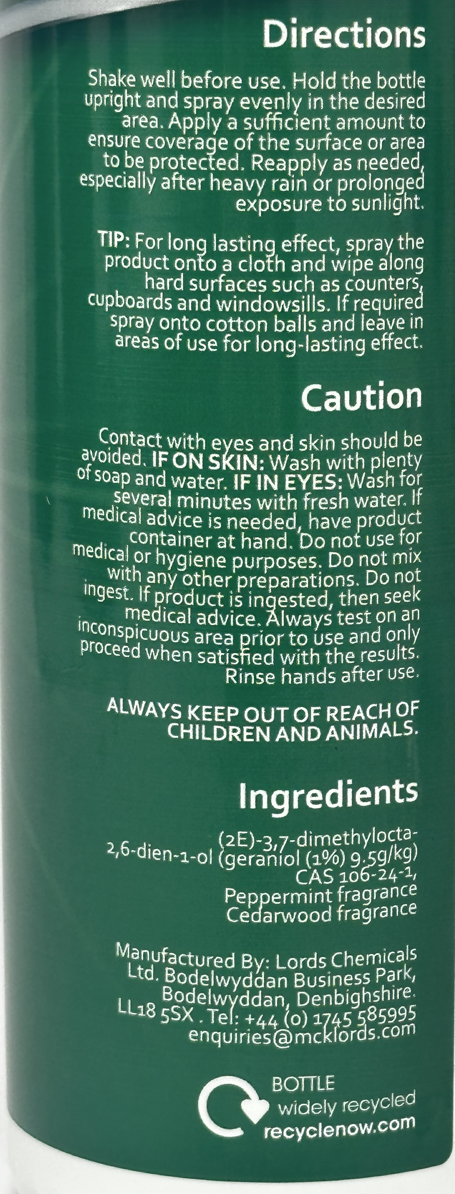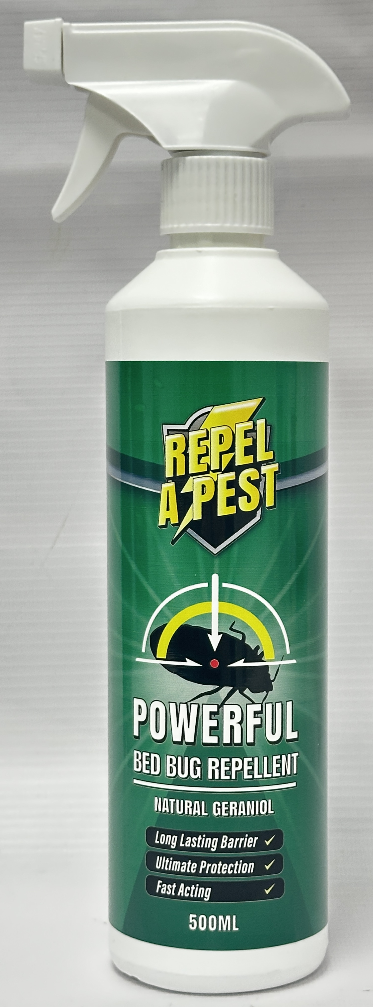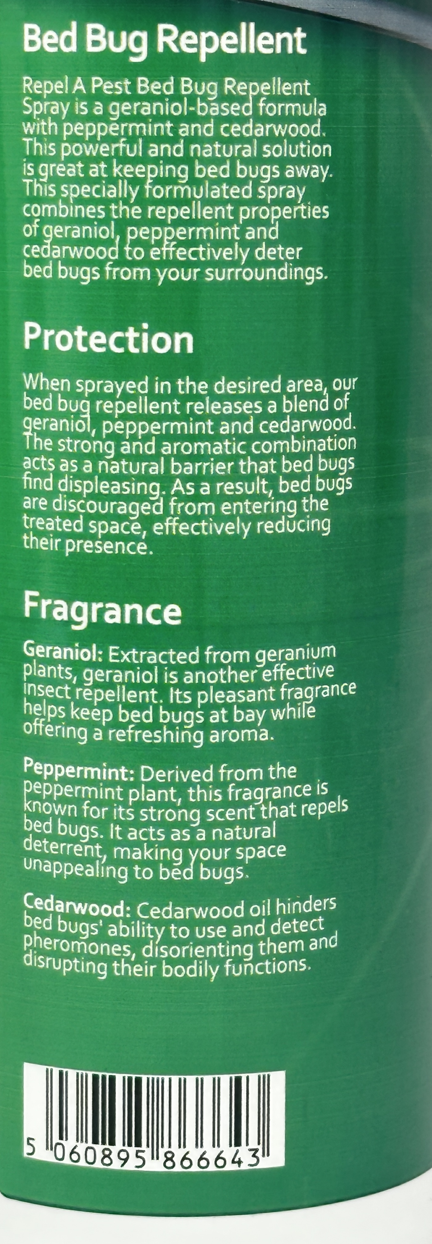 Repel A Pest Bed Bug Repellent Spray is a 500ml trigger spray designed for use around treated indoor and outdoor areas. This product is formulated with geraniol and includes peppermint and cedarwood fragrance.