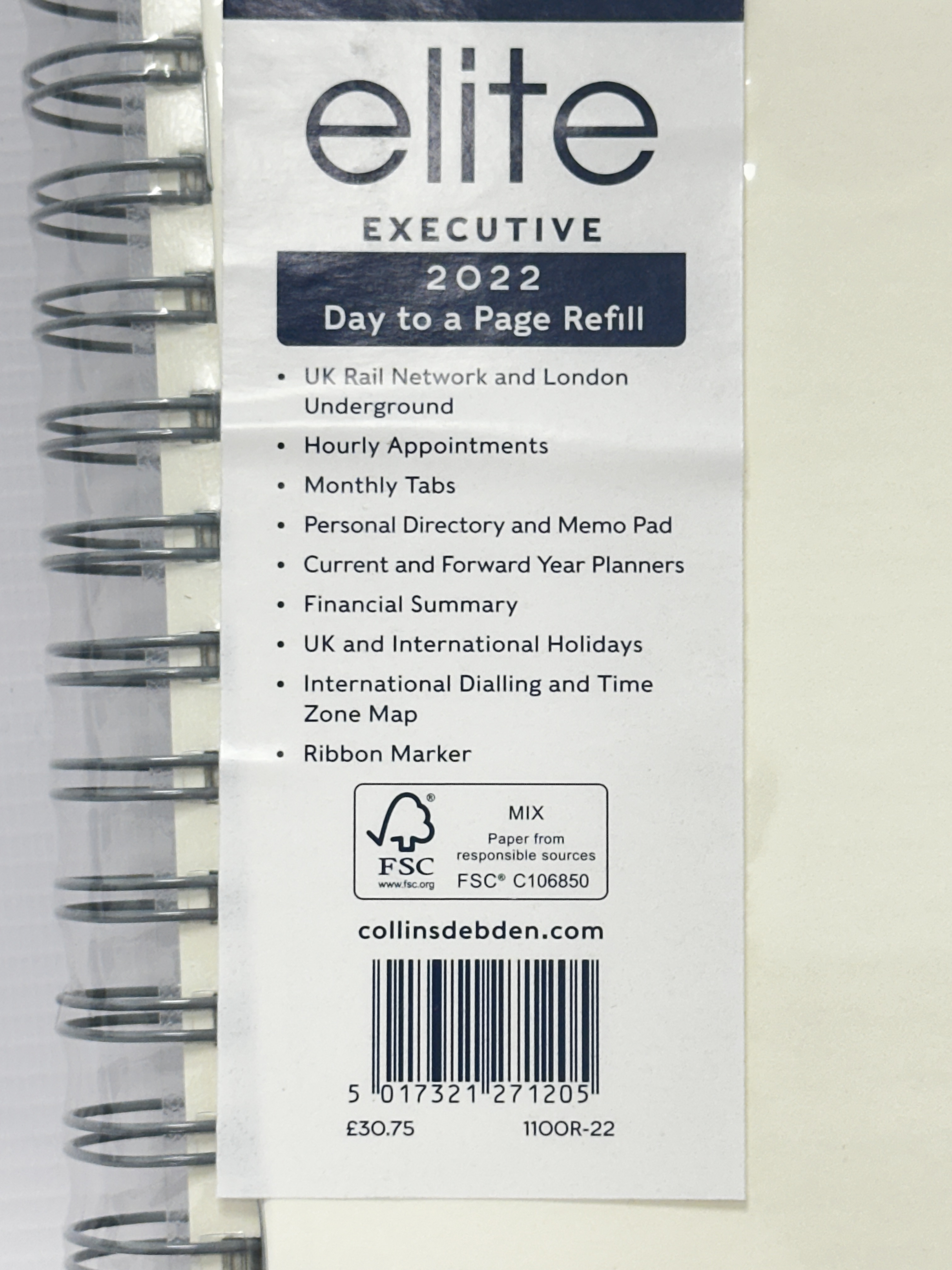 Collins Elite Executive 2022 Day to a Page Refill Personal Directory is a spiral-bound planner and directory item in a cream finish with monthly tabs. This item is being offered free, making it a practical extra for anyone who can still make use of a dated diary refill, reference planner or desk organiser.