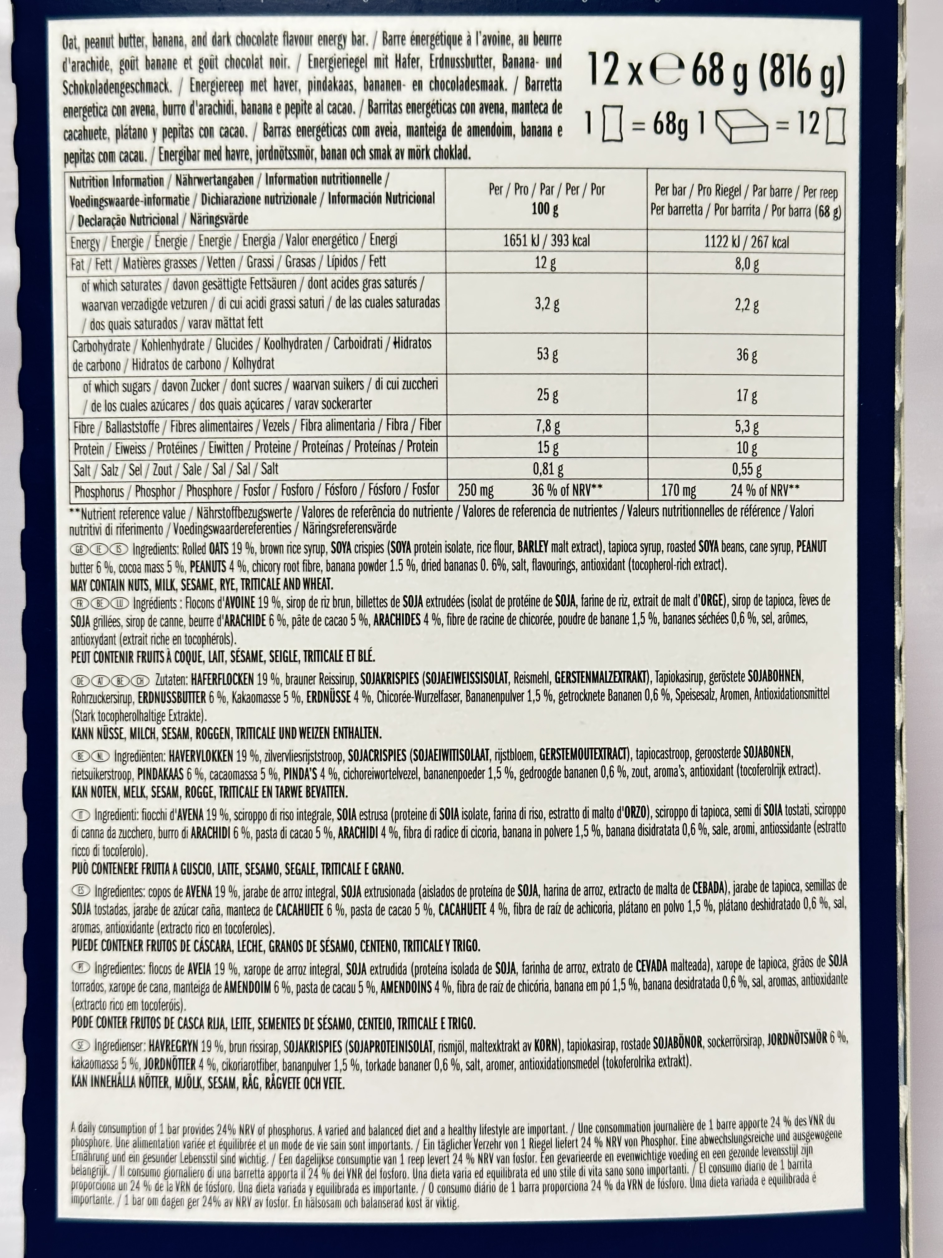 • Made with oats, soy protein, peanuts, banana & dark chocolate