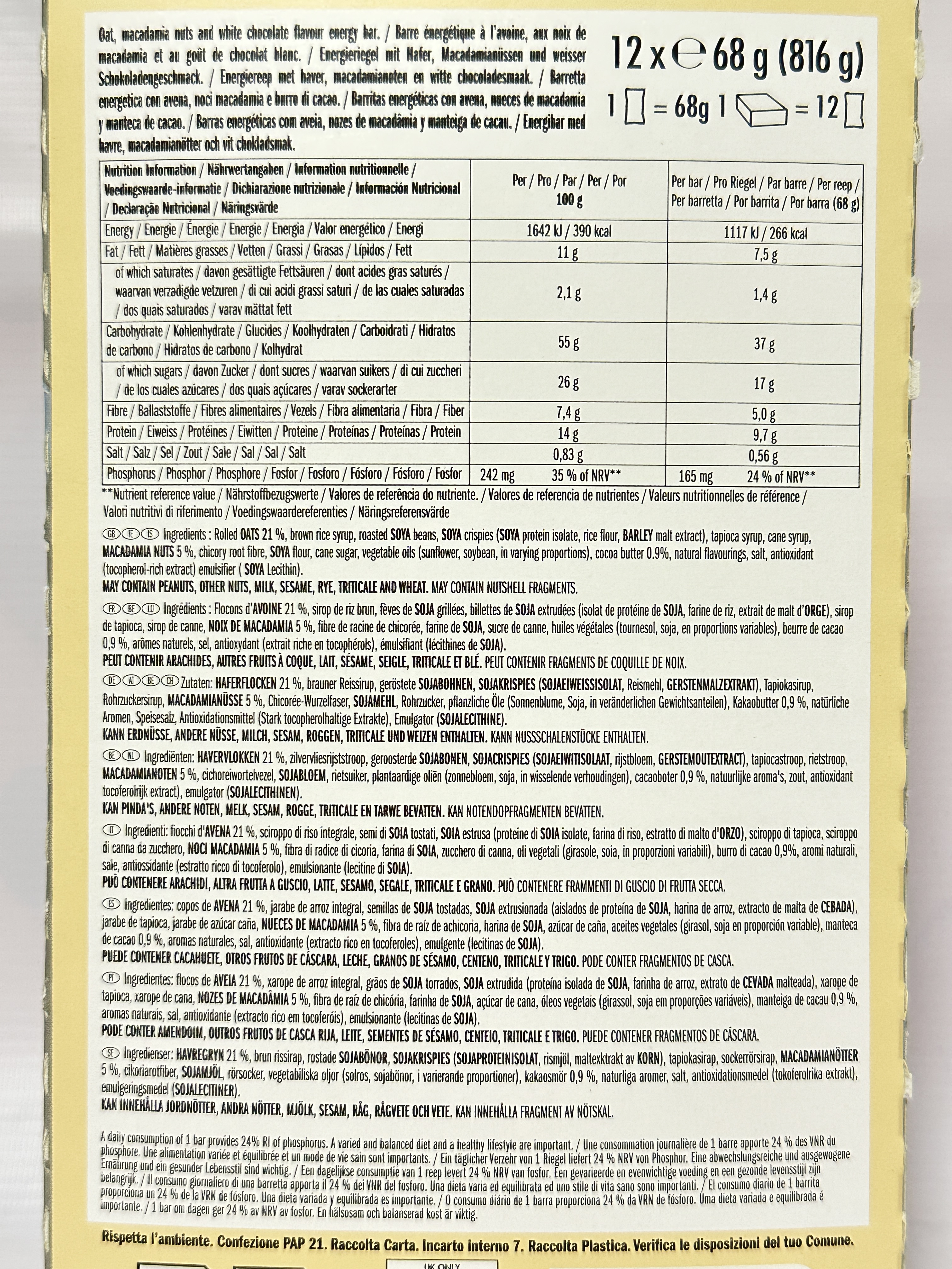 • Made with oats, soy protein, macadamia nuts & white chocolate
