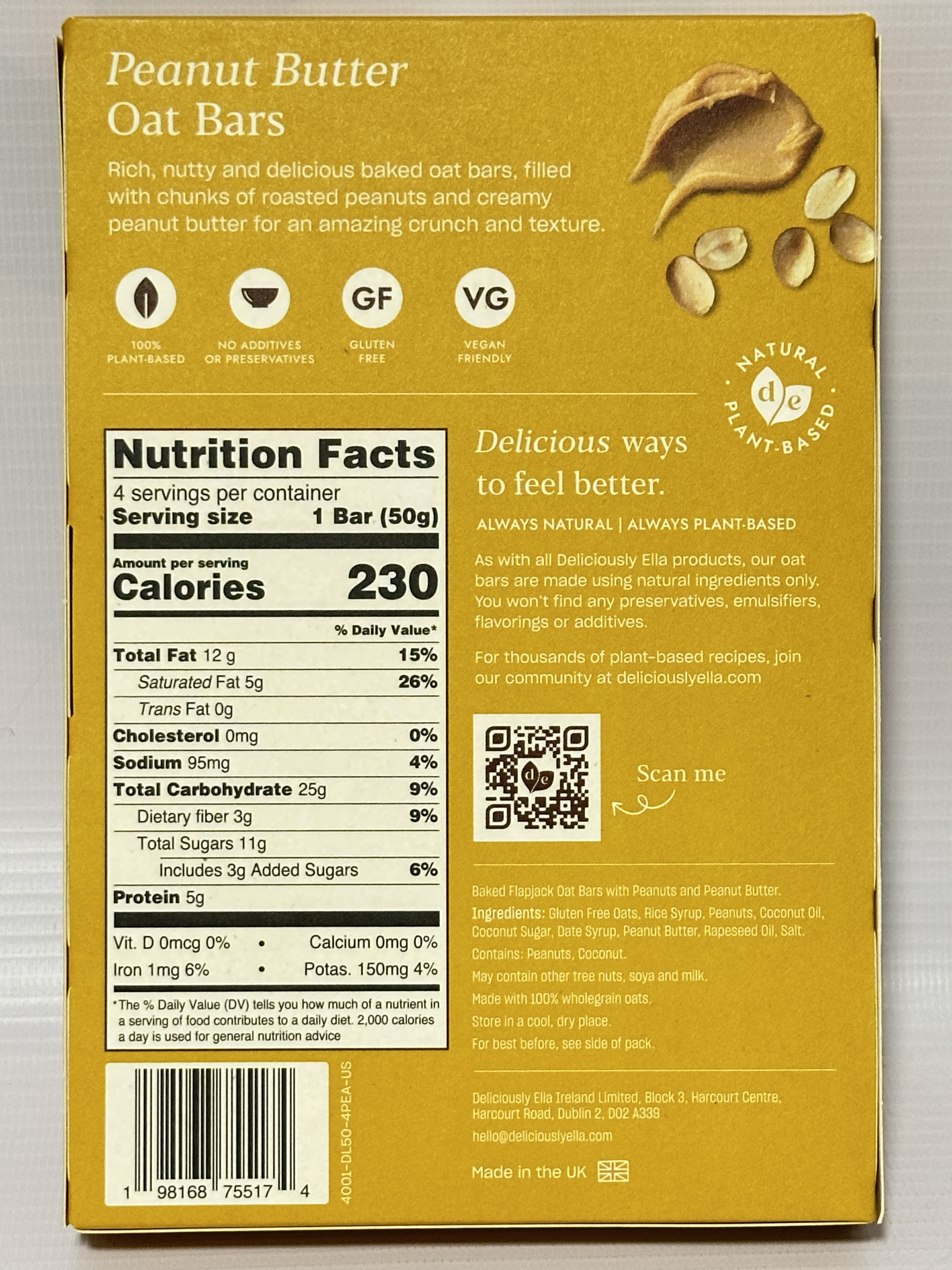 Deliciously Ella Peanut Butter Oat Bars are a wholesome plant-based snack, made with roasted peanuts, creamy peanut butter, and wholegrain oats. Gluten-free, vegan-friendly, and containing no refined cane sugar, these baked bars offer a crunchy texture and nutty flavour – perfect for on-the-go snacking, lunchboxes, or as a healthy pick-me-up.