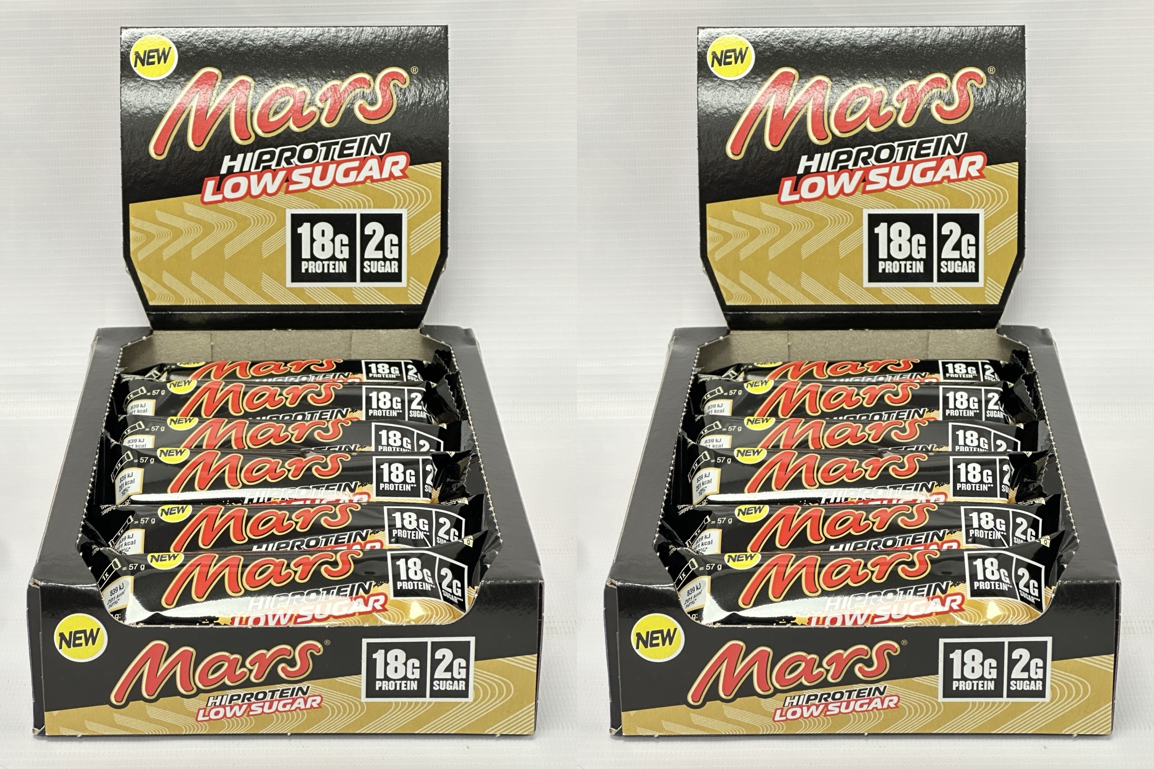 Mars HiProtein Low Sugar Milk Chocolate bars combine a caramel flavoured layer with a soft nougat centre coated in milk chocolate. Each bar provides 18g of protein and 2g of sugar per bar, offering a convenient snack option.