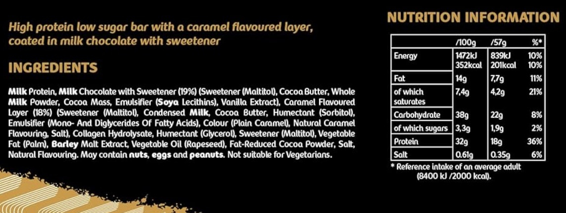 Milk protein, milk chocolate with sweetener (sweetener maltitol, cocoa butter, whole milk powder, cocoa mass, emulsifier (soya lecithins), vanilla extract), caramel flavoured layer (sweetener maltitol, condensed milk, cocoa butter, humectant (sorbitol), emulsifier (mono- and diglycerides of fatty acids), colour (plain caramel), natural caramel flavouring, salt), collagen hydrolysate, humectant (glycerol), sweetener (maltitol), vegetable fat (palm), barley malt extract, vegetable oil (rapeseed), fat-reduced cocoa powder, salt, natural flavouring.