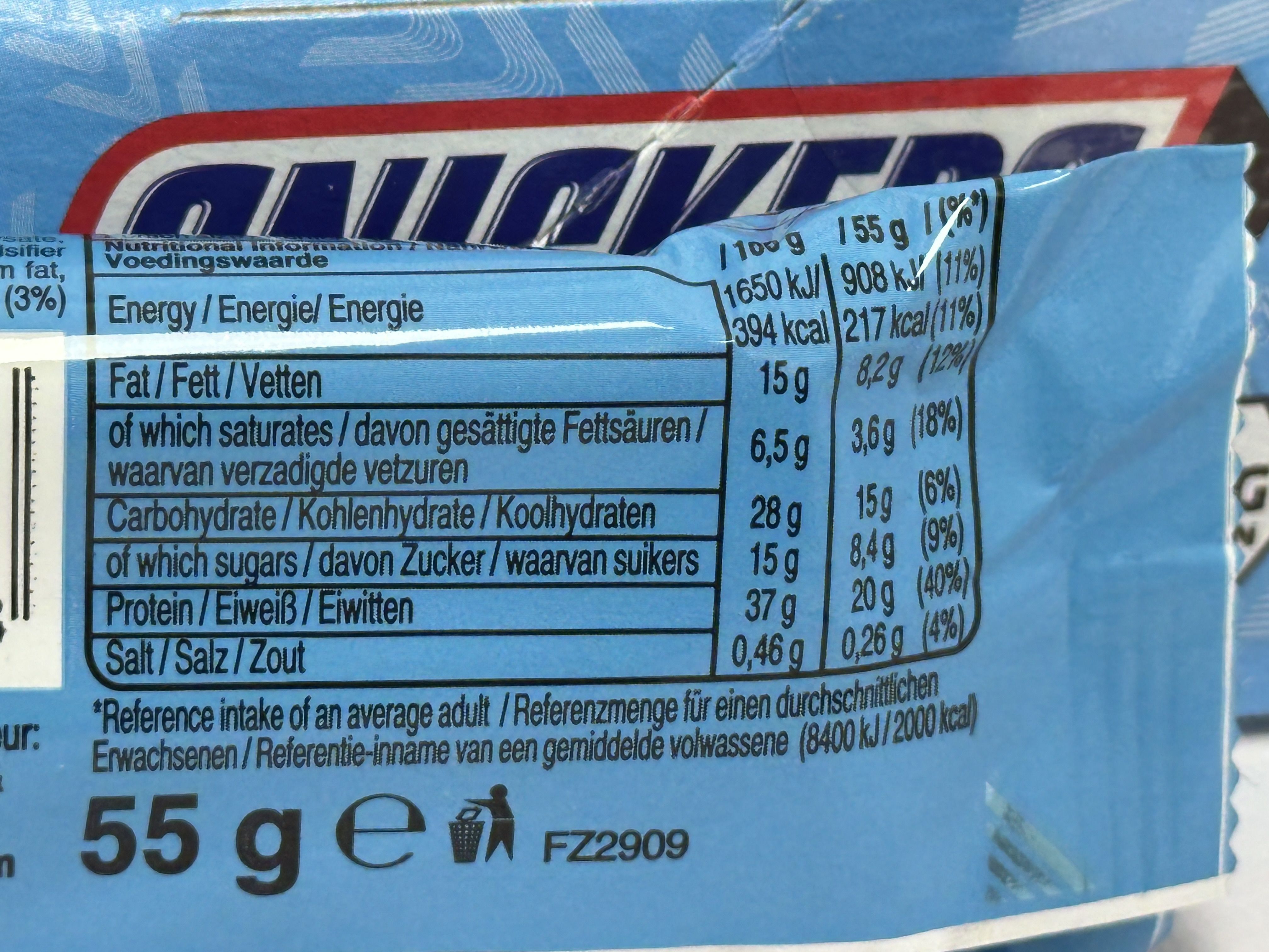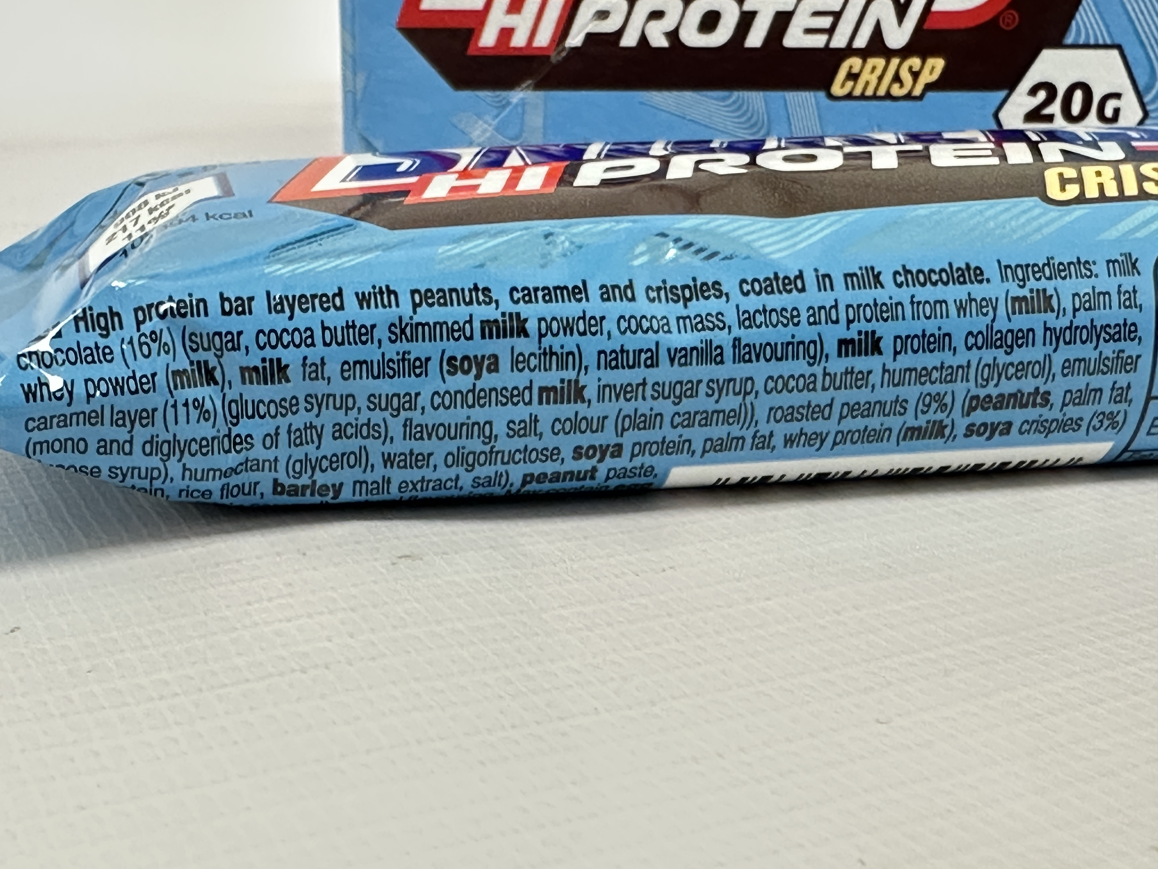 Milk chocolate (sugar, cocoa butter, skimmed milk powder, cocoa mass, lactose, whey powder (milk), milk fat, emulsifier (soya lecithin), natural vanilla flavouring), milk protein, collagen hydrolysate, caramel layer (glucose syrup, sugar, condensed milk, invert sugar syrup, cocoa butter, humectant (glycerol), emulsifier (mono and diglycerides of fatty acids), flavouring, salt, colour (plain caramel)), roasted peanuts, humectant (glycerol), water, oligofructose, soya protein, palm fat, whey protein (milk), soya crispies (rice flour, soya protein), barley malt extract, peanut paste.