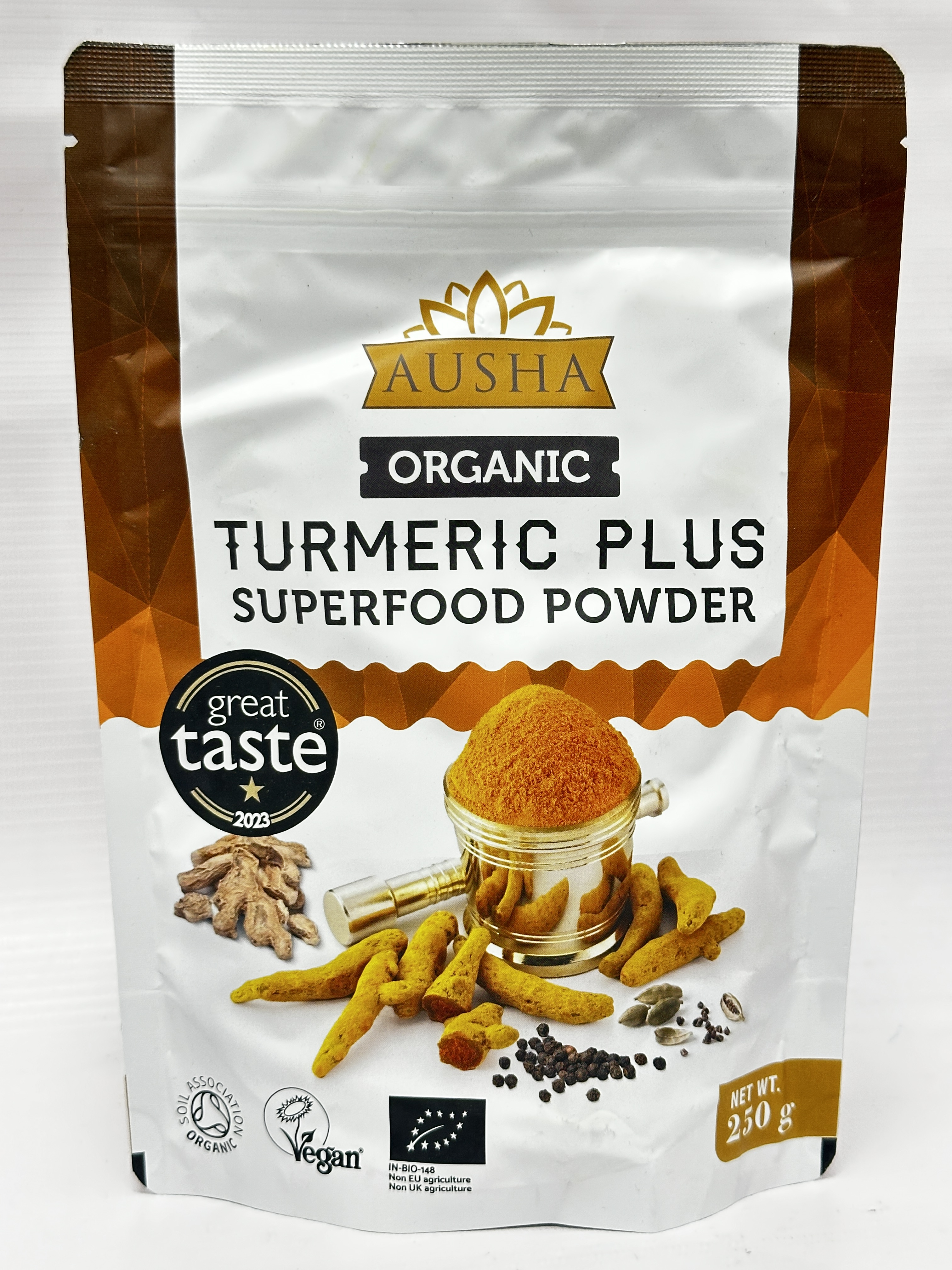 Organic Turmeric Plus Superfood Powder is a versatile organic spice blend made with turmeric, ginger, black pepper and cardamom. Supplied in a 250g pouch, it is ideal for adding to cooking, turmeric shots, lattes, smoothies and warm drinks.