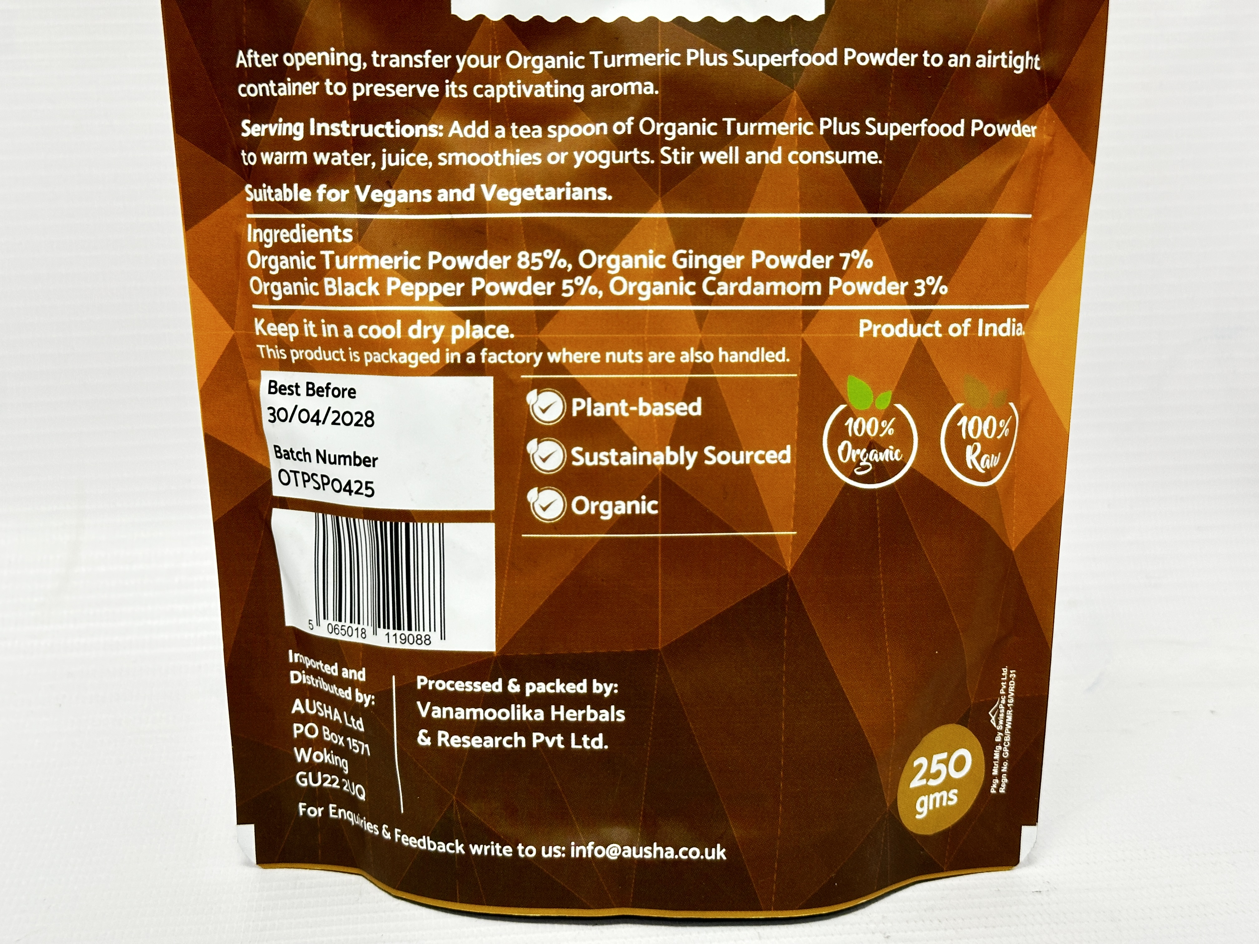 Add a teaspoon of Organic Turmeric Plus Superfood Powder to warm water, juice, smoothies or yoghurts. Stir well and consume.