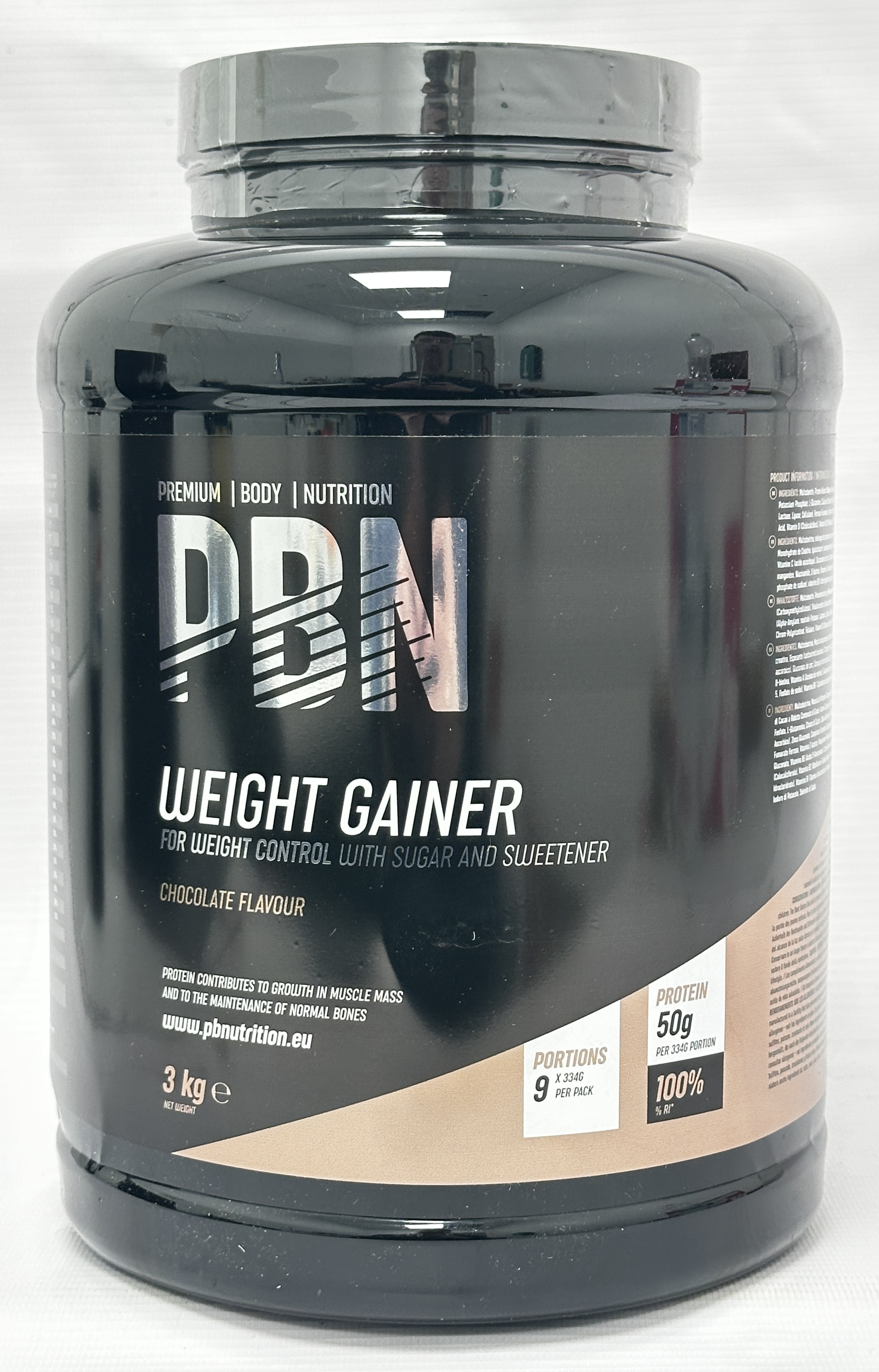PBN Weight Gainer Chocolate Flavour is a high protein mass gainer powder supplied in a 3kg tub. Designed as a food supplement powder, this larger format provides 9 portions per pack, with each 334g portion delivering 50g of protein as shown on the label.
