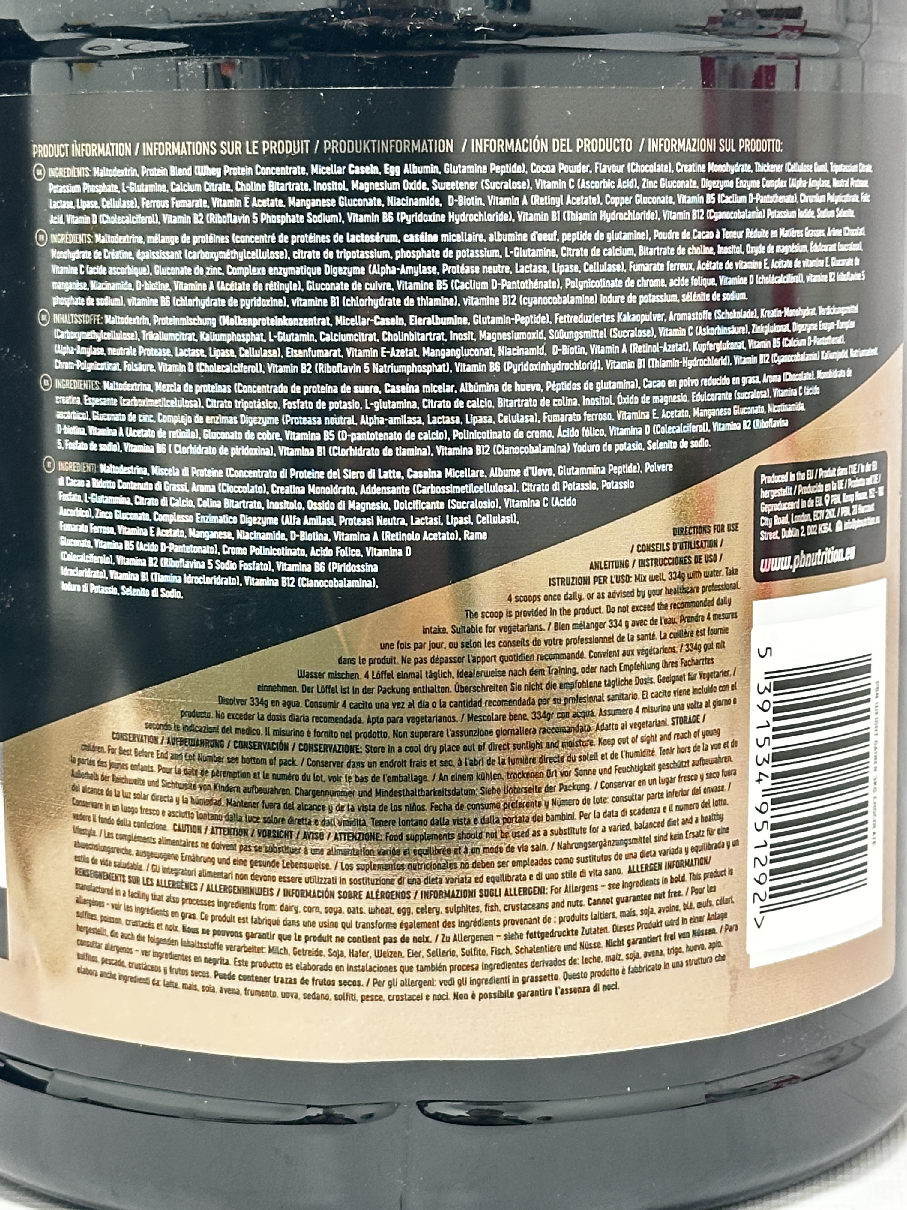 Maltodextrin, Protein Blend (Whey Protein Concentrate, Micellar Casein, Egg Albumin, Glutamine Peptide), Cocoa Powder, Flavour (Chocolate), Creatine Monohydrate, Thickener (Modified Gum, Emulsified / carboxymethylcellulose wording shown on pack), Tripotassium Phosphate, L-Glutamine, Calcium Citrate, Choline Bitartrate, Inositol, Magnesium Oxide, Sweetener (Sucralose), Vitamin C (Ascorbic Acid), Zinc Gluconate, Digezyme Enzyme Complex (Alpha-Amylase, Protease, Lactase, Cellulase), Ferrous Fumarate, Vitamin E Acetate, Manganese Gluconate, Niacinamide, D-Biotin, Vitamin A (Retinyl Acetate), Copper Gluconate, Vitamin B5 (Calcium D-Pantothenate), Chromium Picolinate, Folic Acid, Vitamin D (Cholecalciferol), Vitamin B2 (Riboflavin 5 Phosphate Sodium), Vitamin B6 (Pyridoxine Hydrochloride), Vitamin B1 (Thiamin Hydrochloride), Vitamin B12 (Cyanocobalamin), Potassium Iodide, Sodium Selenite.