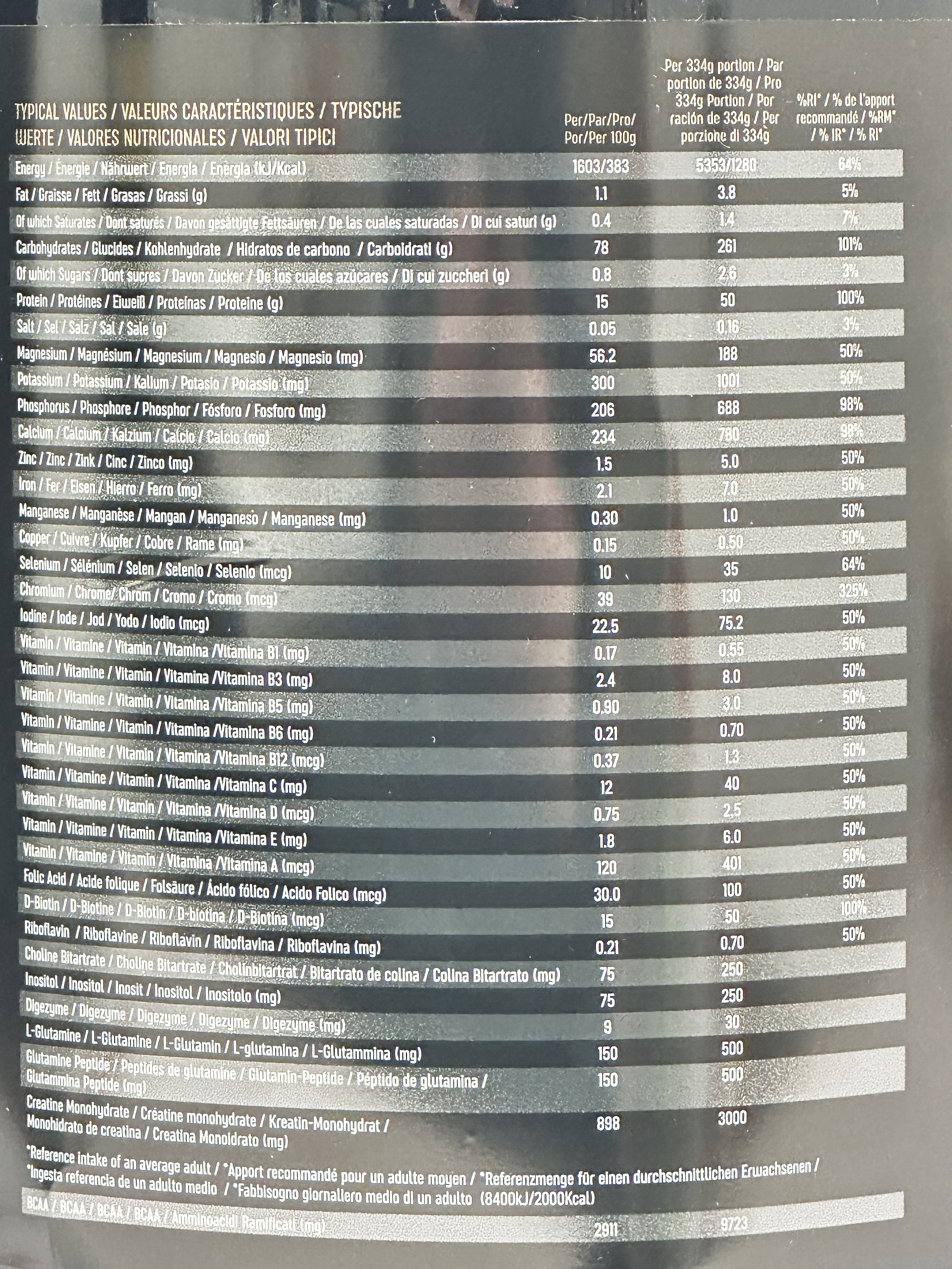 Selected vitamins and minerals per 334g portion: Magnesium 188mg, Potassium 1001mg, Phosphorus 688mg, Calcium 780mg, Zinc 5.0mg, Iron 7.0mg, Manganese 1.0mg, Copper 0.50mg, Selenium 35mcg, Chromium 130mcg, Iodine 75.2mcg, Vitamin B1 0.55mg, Vitamin B3 8.0mg, Vitamin B5 3.0mg, Vitamin B6 0.70mg, Vitamin B12 1.3mcg, Vitamin C 40mg, Vitamin D 2.5mcg, Vitamin E 6.0mg, Vitamin A 401mcg, Folic Acid 100mcg, D-Biotin 50mcg, Riboflavin 0.70mg, Choline Bitartrate 250mg, Inositol 250mg, Digezyme 30mg, L-Glutamine 500mg, Glutamine Peptide 500mg, Creatine Monohydrate 3000mg.