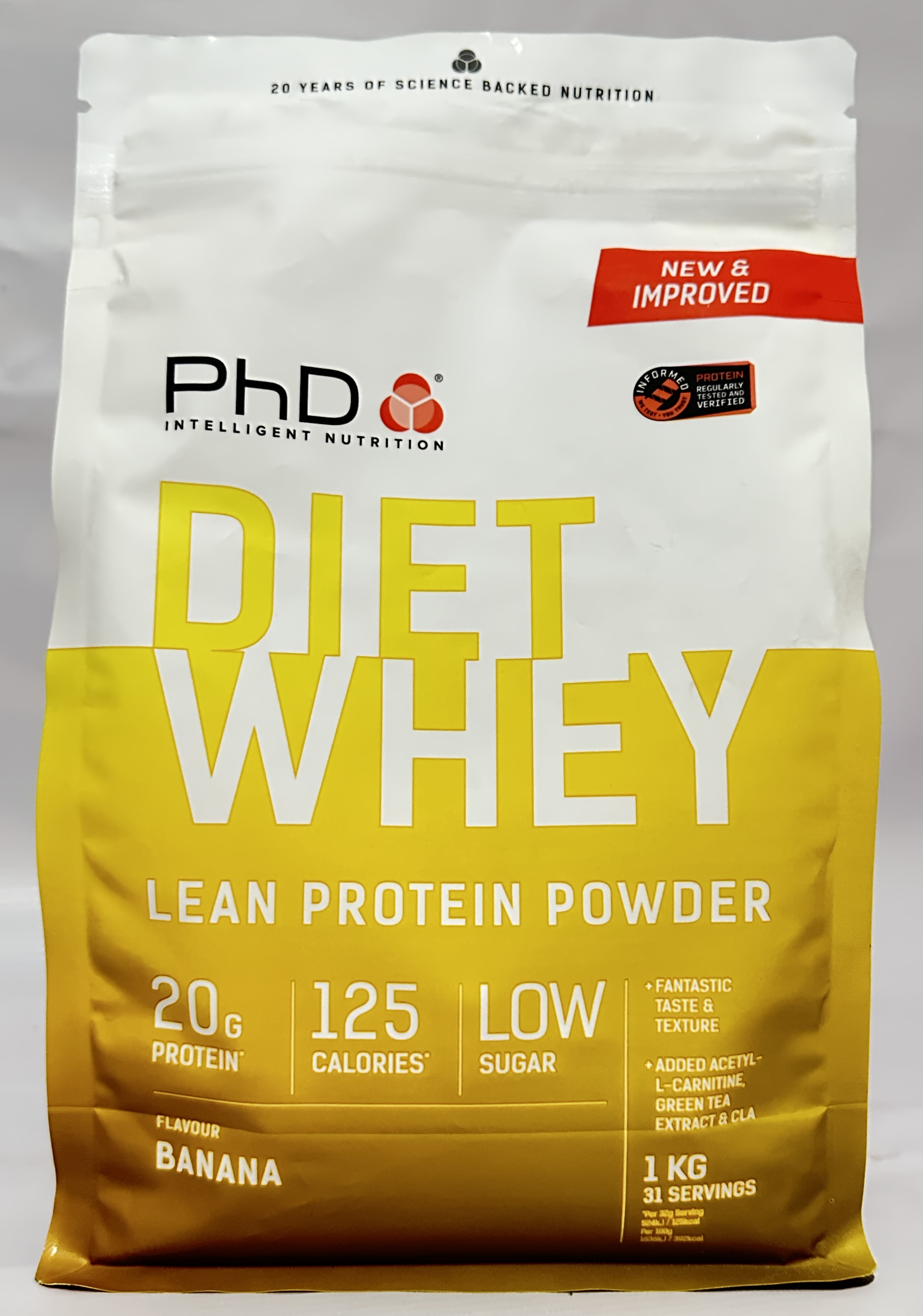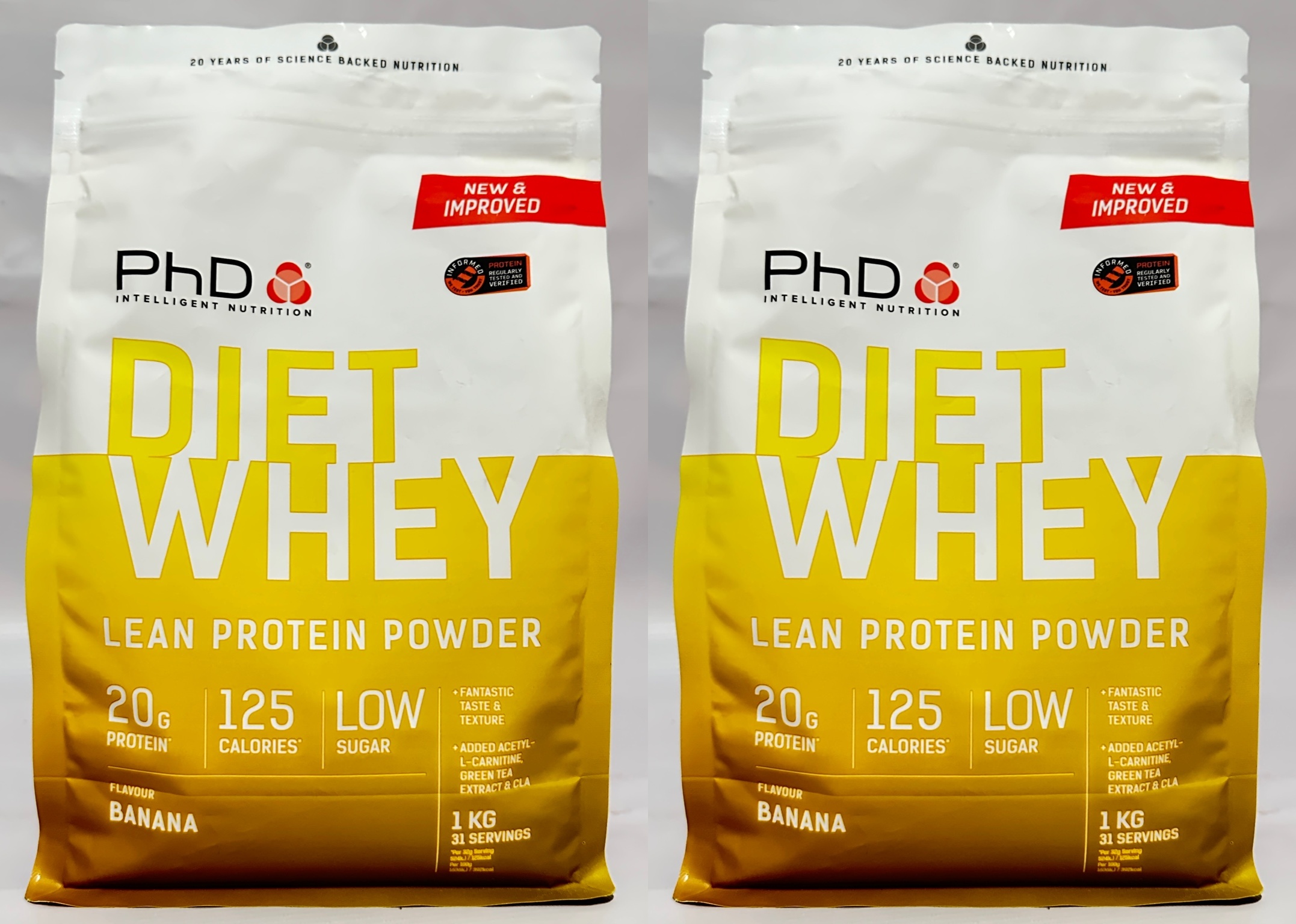 This listing is for 2 x 1kg bags (total 2kg) of PhD Diet Whey Lean Protein Powder in Banana flavour.