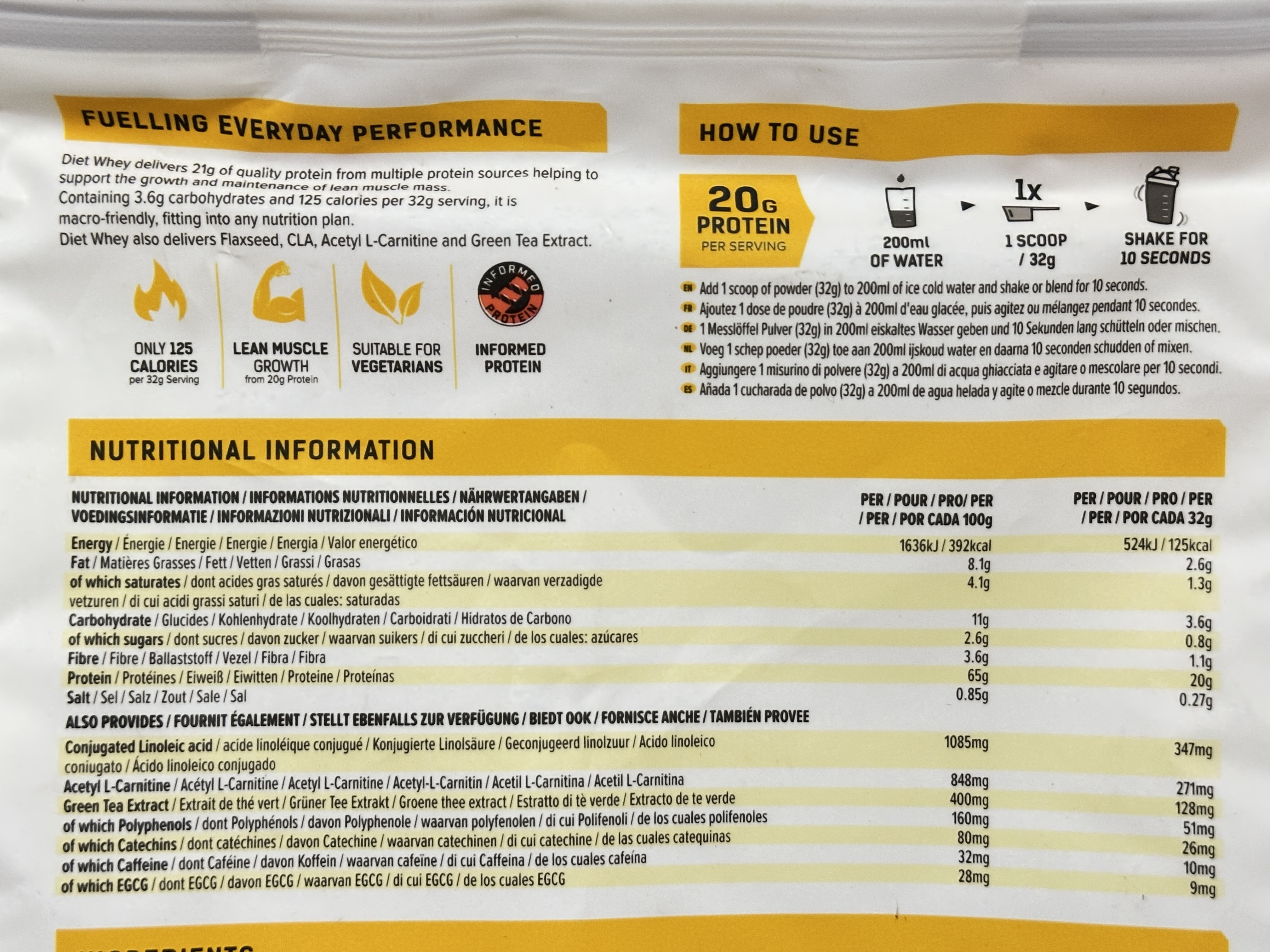 Add 1 scoop (32g) to 200ml of cold water. Shake or blend for approximately 10 seconds. Consume once daily or as part of your nutrition plan.