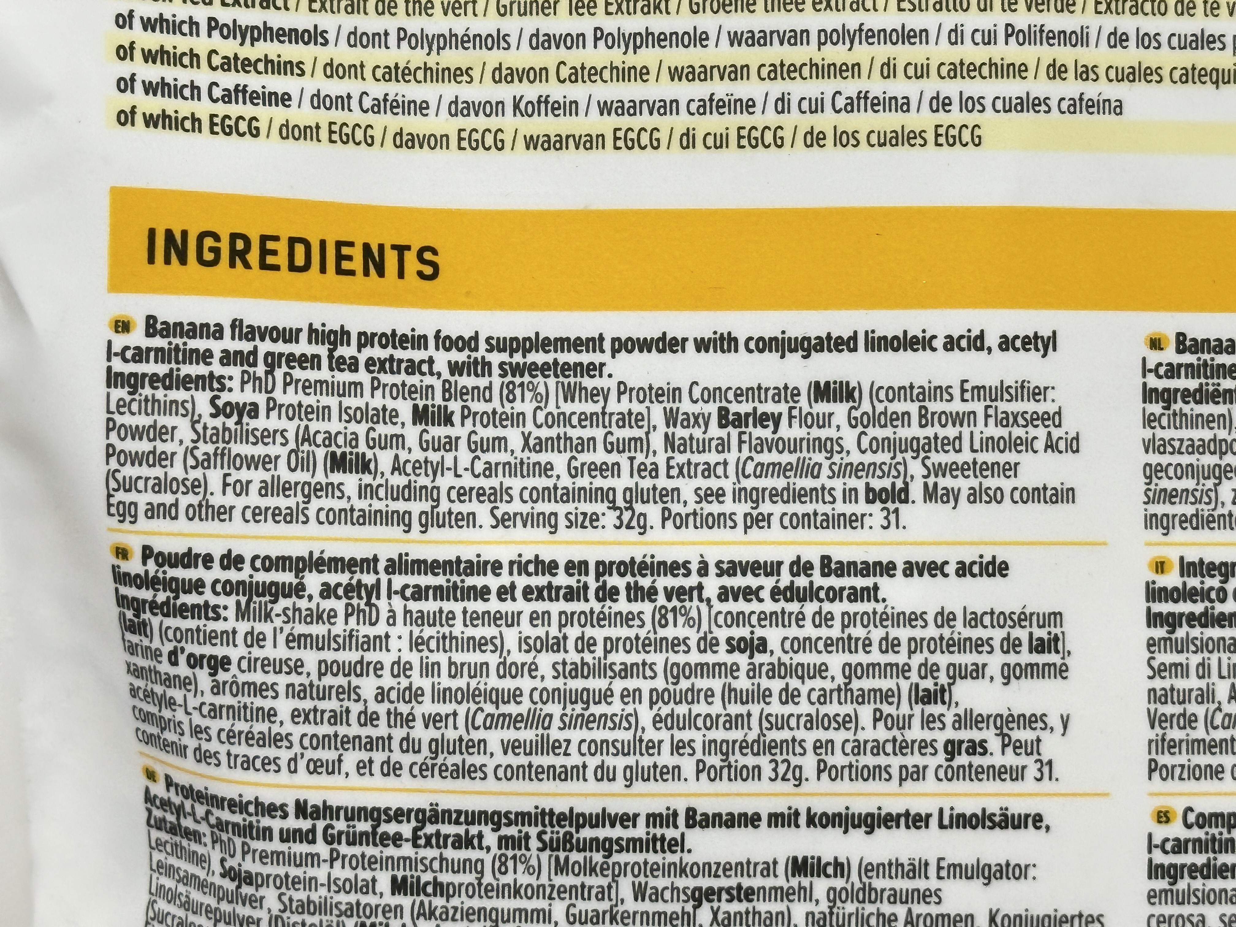 PhD Premium Protein Blend (81%) [Whey Protein Concentrate (Milk), Soya Protein Isolate, Milk Protein Concentrate], Waxy Barley Flour (Gluten), Golden Brown Flaxseed Powder, Stabilisers (Acacia Gum, Guar Gum, Xanthan Gum), Natural Flavourings, Conjugated Linoleic Acid Powder (Safflower Oil) (Milk), Acetyl-L-Carnitine, Green Tea Extract (Camellia sinensis), Sweetener (Sucralose).