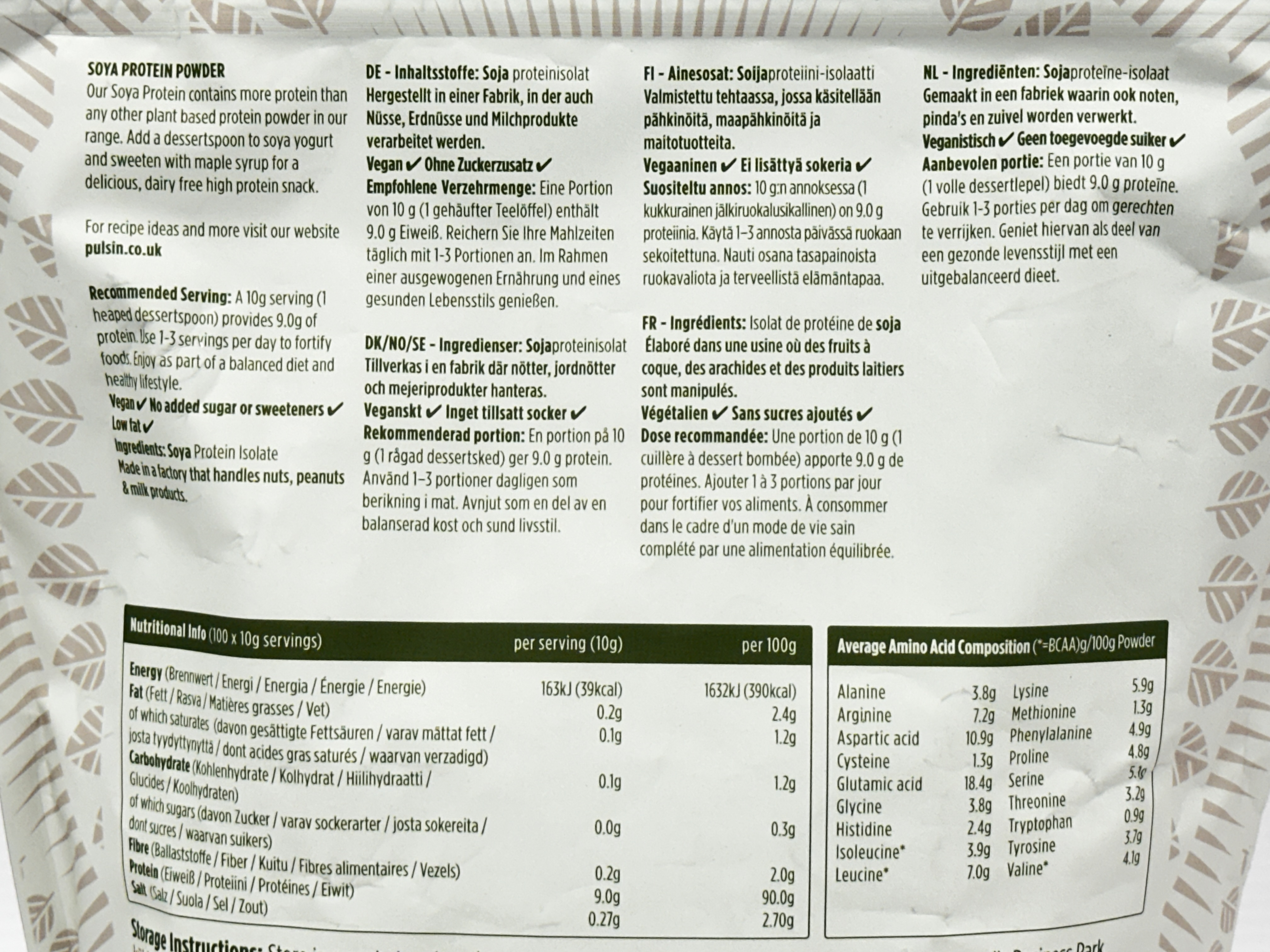 Pulsin Soya Protein Isolate Powder is a natural and unflavoured plant based protein powder in a 1kg pack. With 90% protein as shown on the pack, this simple soya protein powder is ideal for adding to smoothies, yoghurts, cereals, soups and desserts.