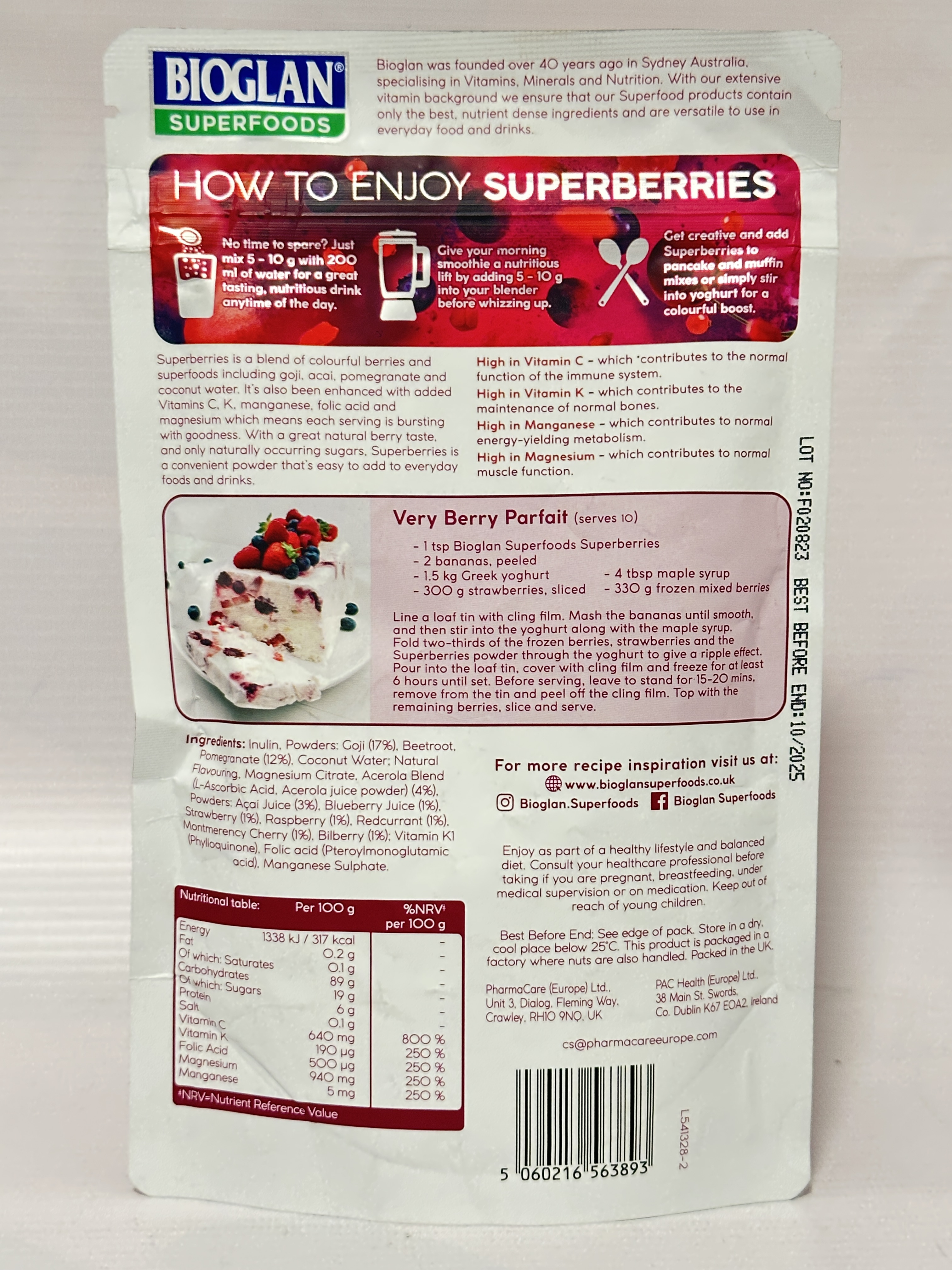 Acai Berry Powder, Goji Berry Powder, Blueberry Powder, Strawberry Powder, Cranberry Extract, Natural Flavourings.