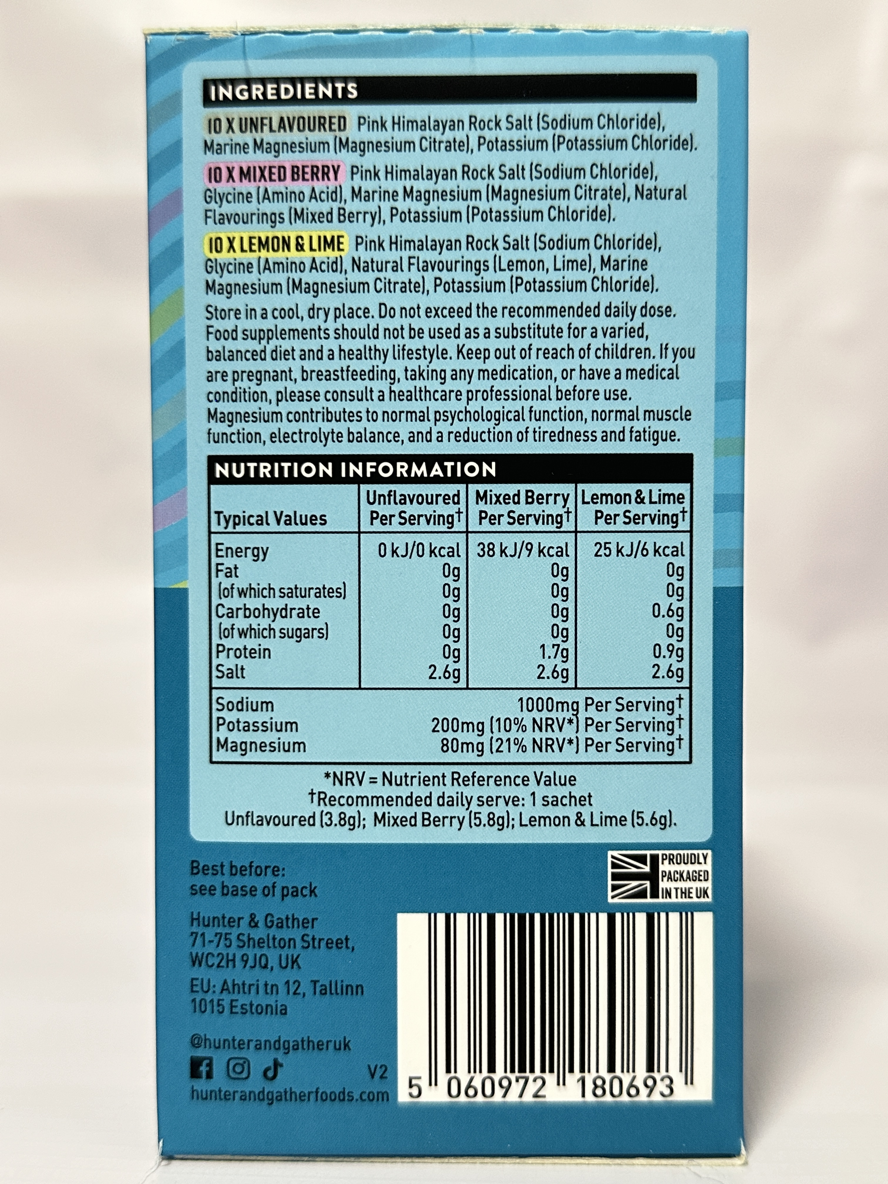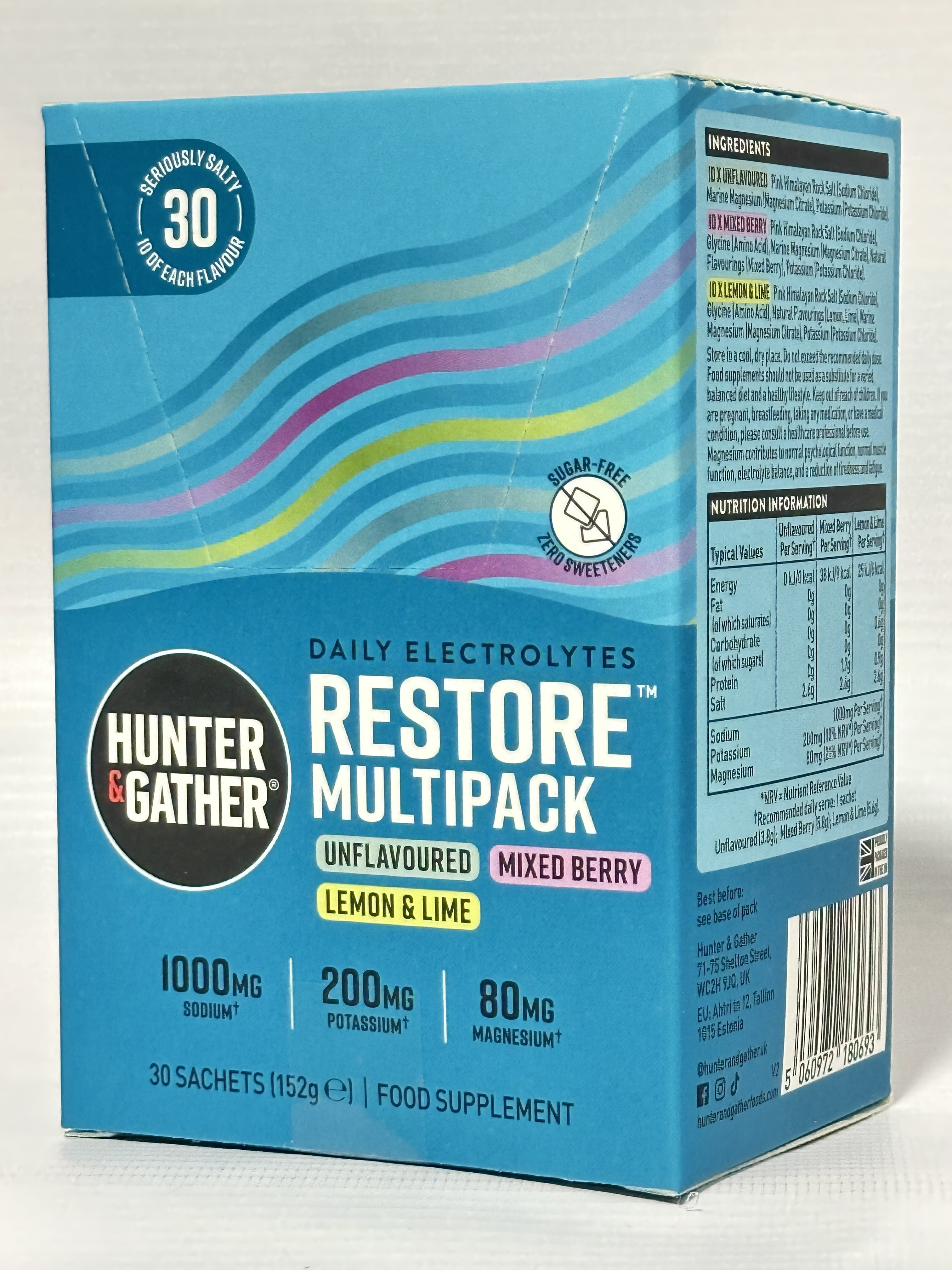 Rehydrate smarter with Hunter & Gather Restore Electrolytes Variety Box – 30 Sachets, featuring three clean, natural flavours: Unflavoured, Mixed Berry, and Lemon & Lime. Each sachet delivers 1000mg Sodium, 200mg Potassium, and 80mg Magnesium — the optimal mineral ratio for hydration, energy, and recovery, with zero sugar, zero sweeteners, and zero fillers.