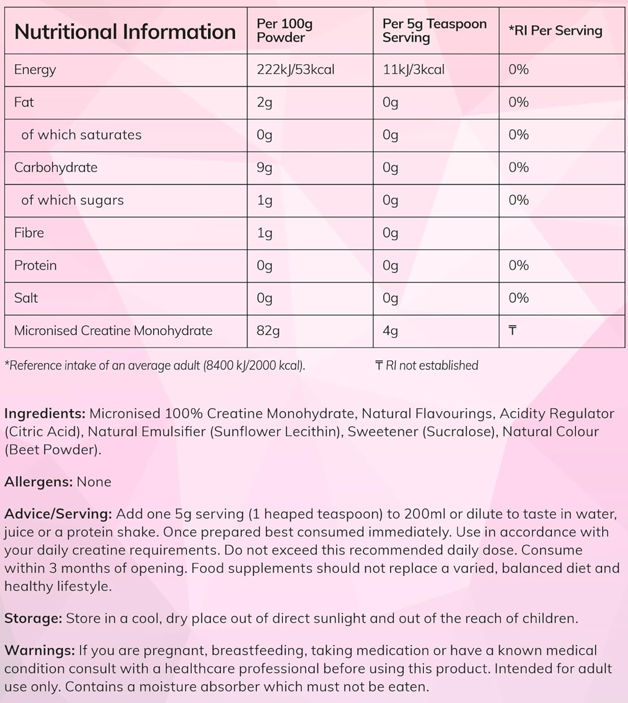 Ingredients: Micronised 100% Creatine Monohydrate, Natural Flavourings, Acidity Regulator (Citric Acid), Natural Emulsifier (Sunflower Lecithin), Sweetener (Sucralose), Natural Colour (Beet Powder).