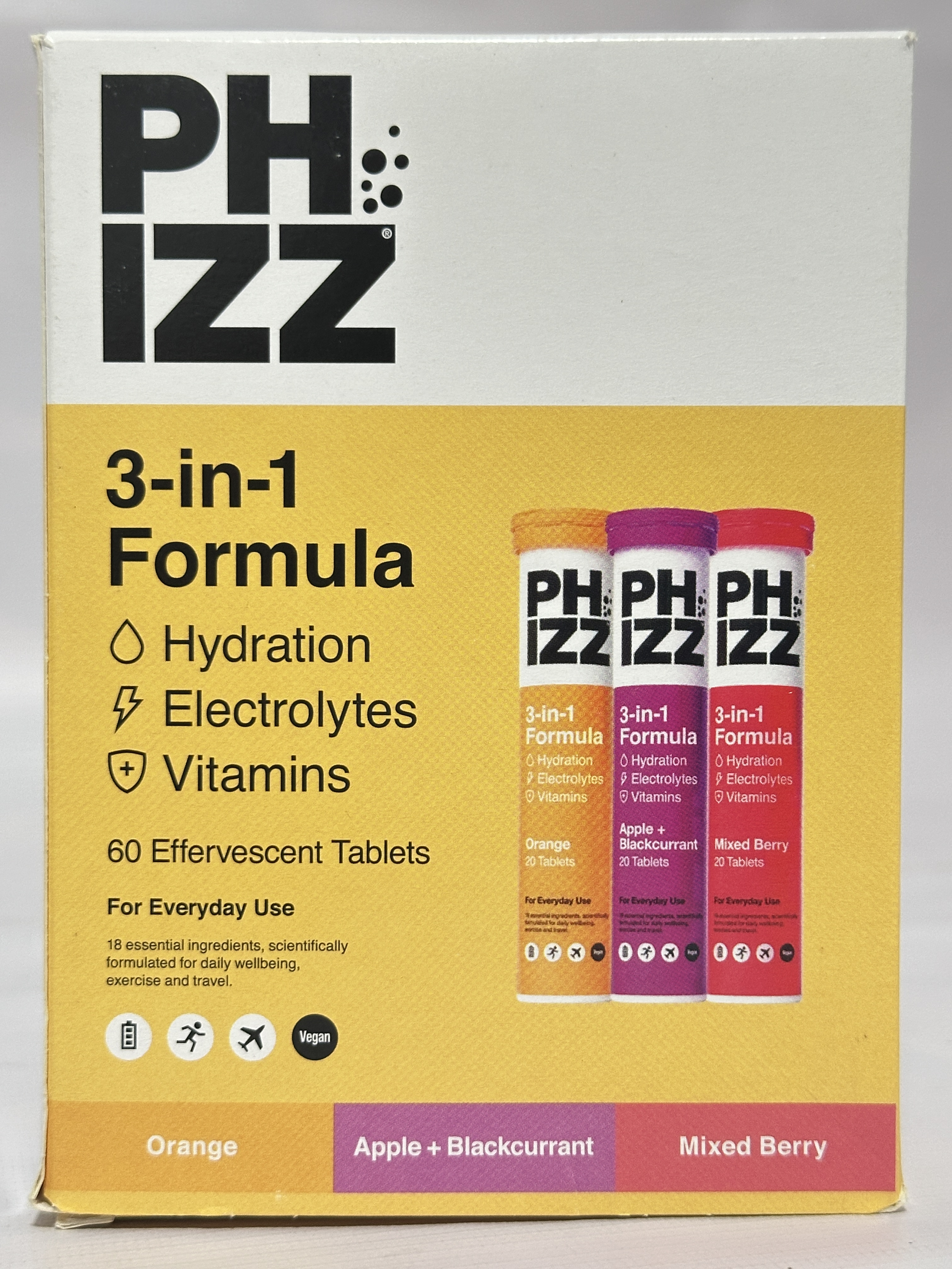 Phizz 3-in-1 Hydration, Electrolyte & Multivitamin Tablets – Variety Pack – 60 Effervescent Tablets (Orange, Apple & Blackcurrant, Mixed Berry)