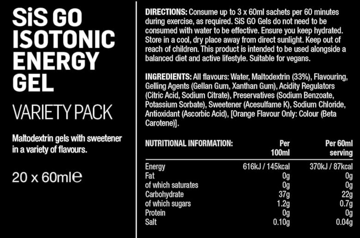Per gel: 22g carbohydrates.