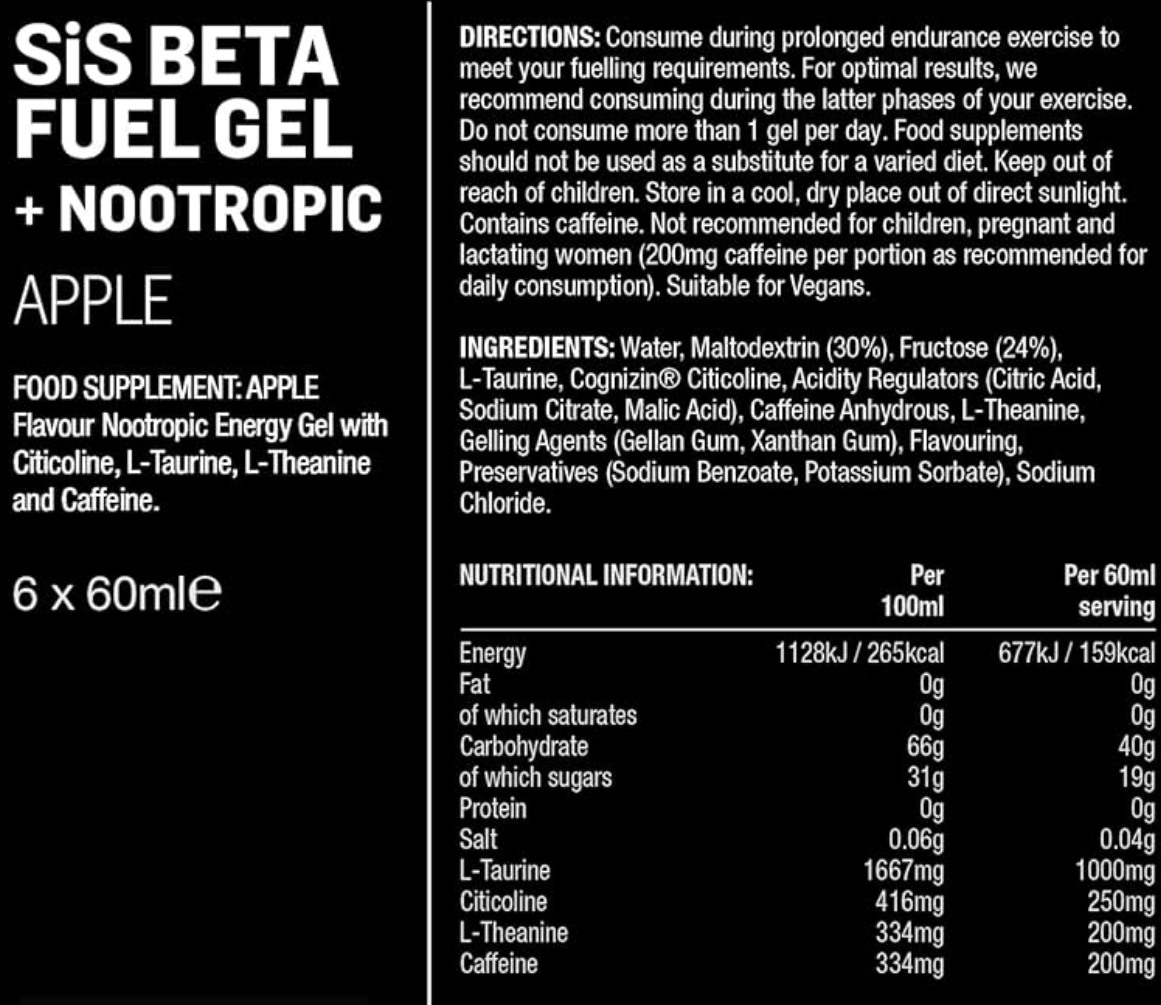 SiS Beta Fuel Energy Gel Apple + Nootropics 6 x 60ml – High Caffeine Endurance Fuel, Vegan