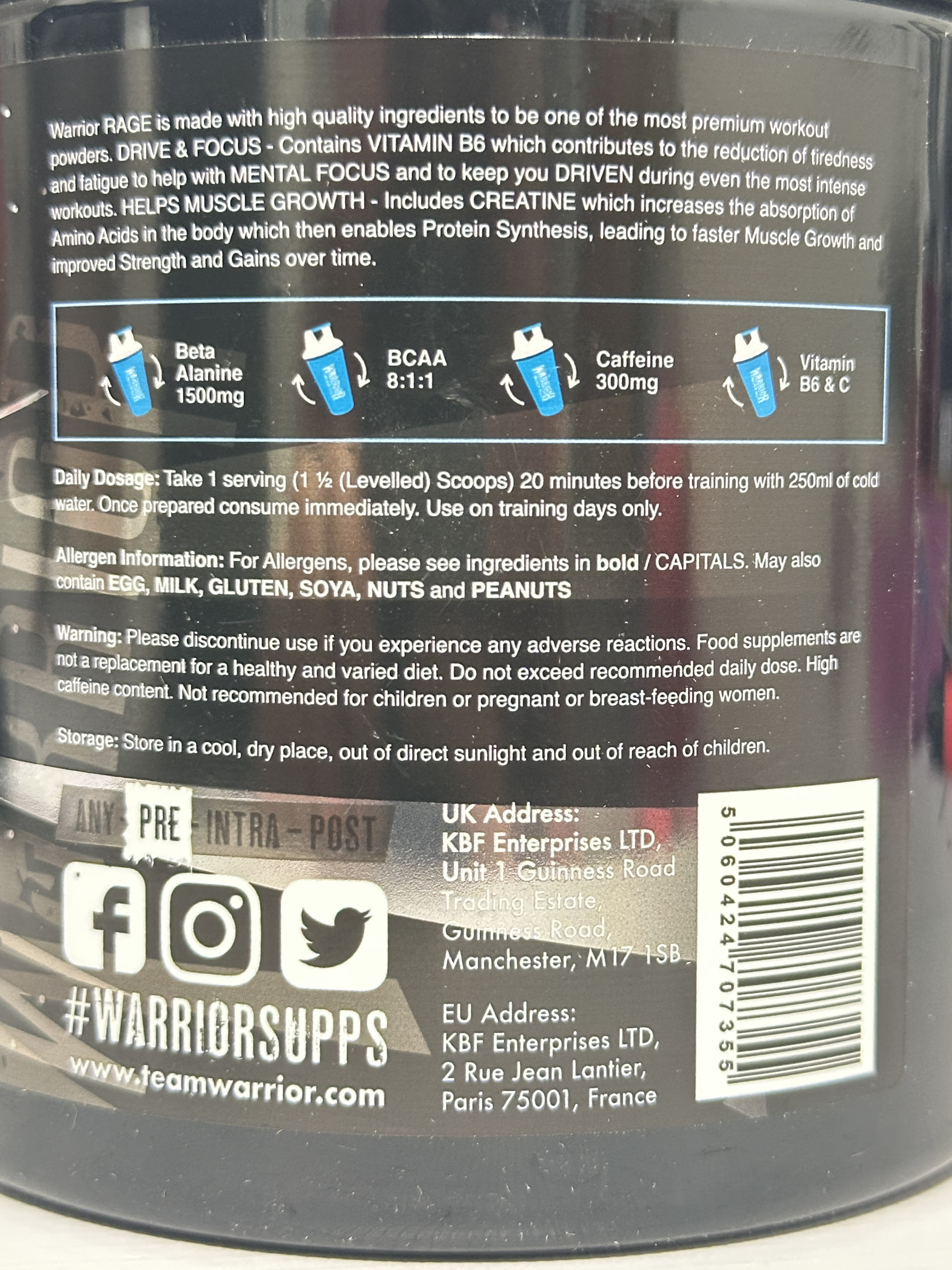 Warrior Rage Pre-Workout is a powdered food supplement designed to be taken before training. This Blazin’ Blue Raz flavoured formula contains a blend of creatine gluconate, beta alanine, BCAAs, caffeine, amino acids and added vitamins. Each tub provides 45 servings, with a serving size of 8.7g mixed with water prior to training.