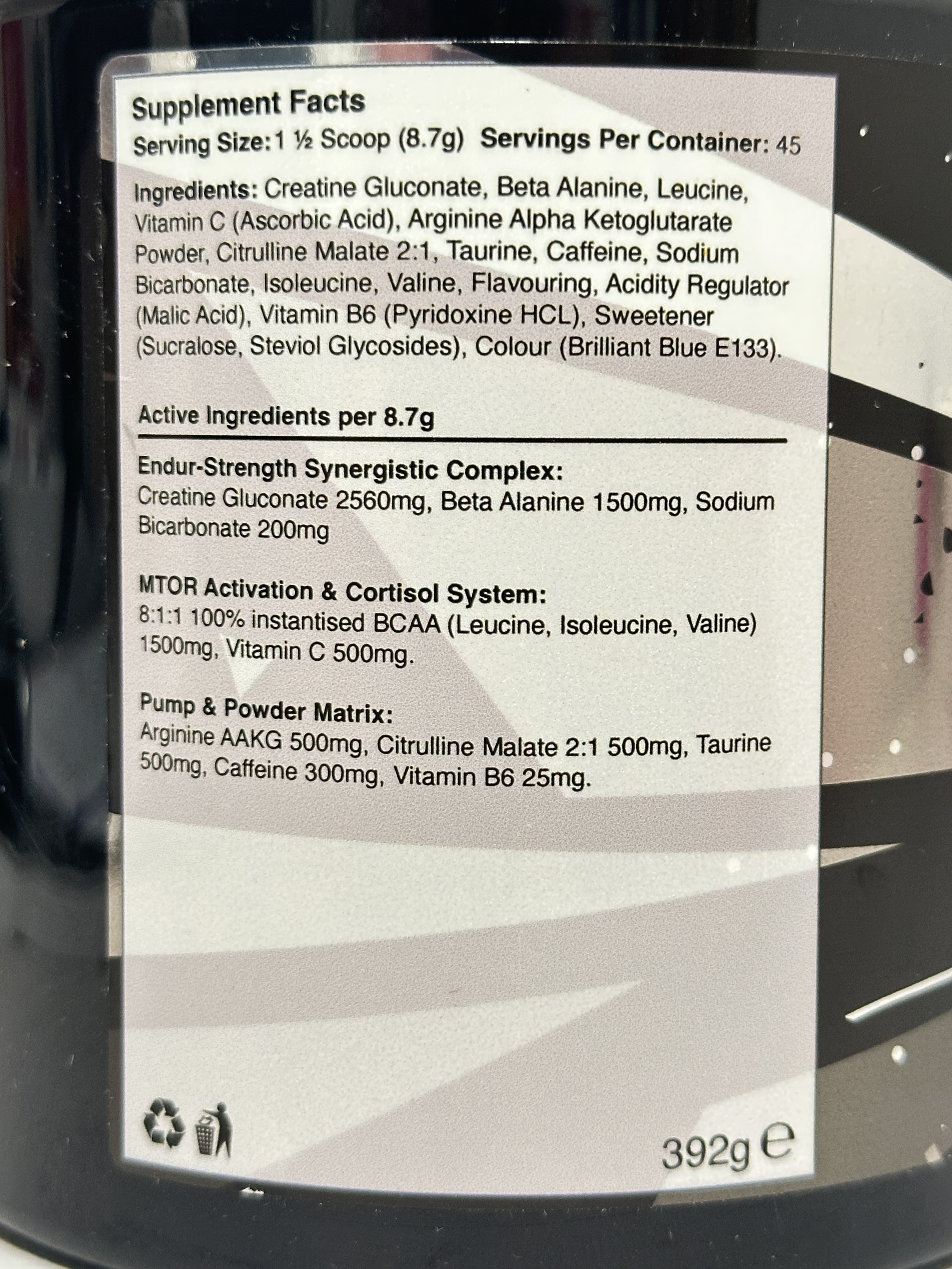 - Includes creatine gluconate, beta alanine and BCAAs