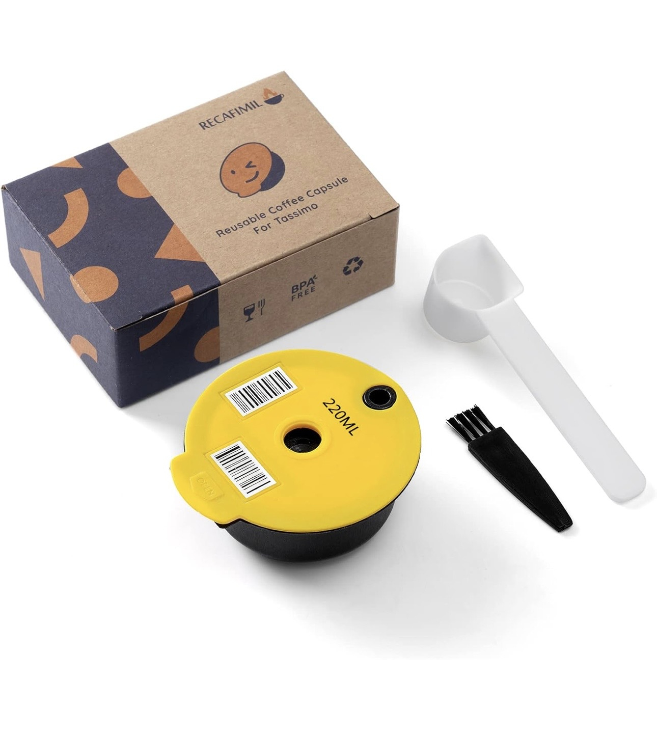 RECAFIMIL Reusable Coffee Pods 220ml Refillable Coffee Capsule with Yellow Silicone Lid Compatible with Bosch Tassimo Machine