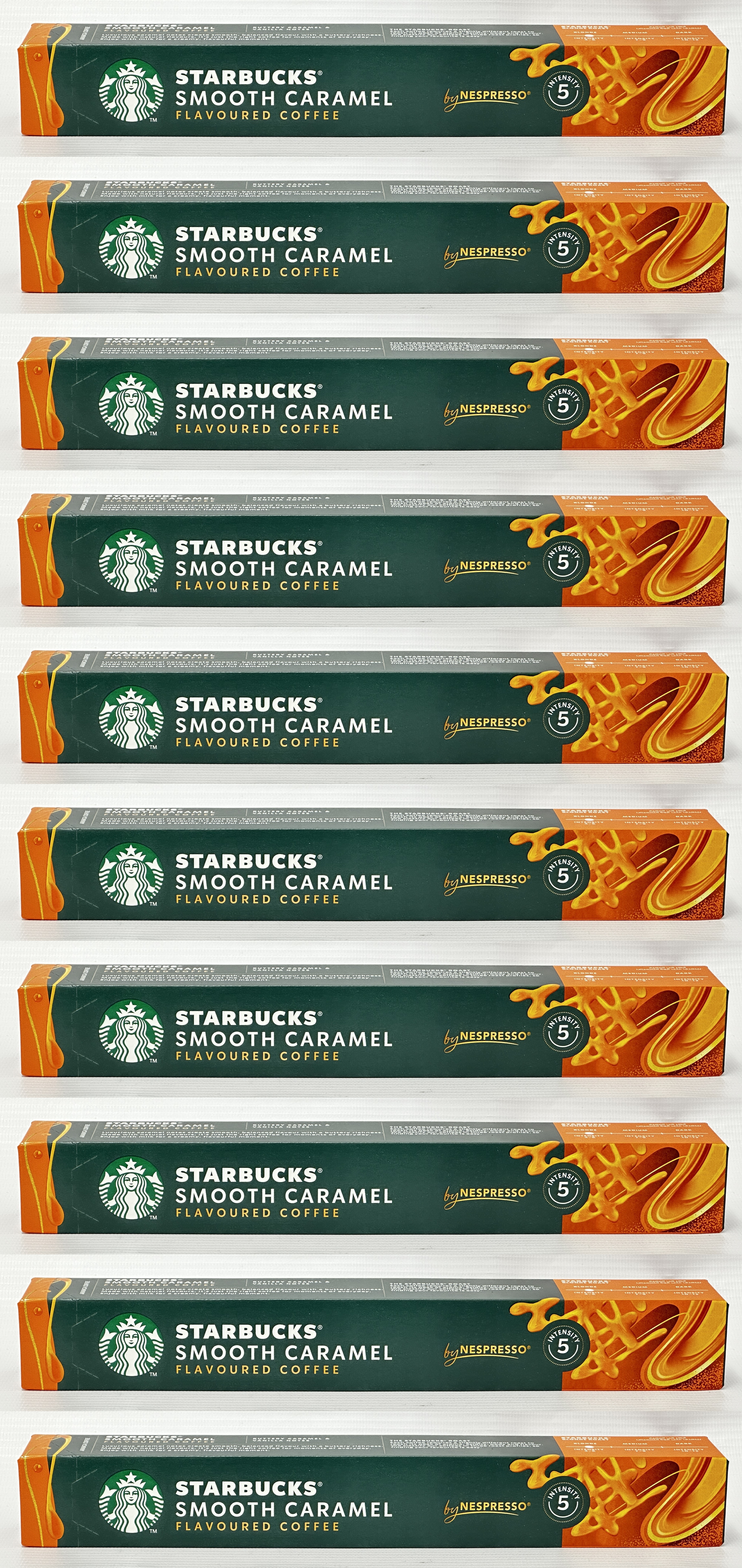 Starbucks Smooth Caramel by Nespresso is a flavoured coffee capsule blend with 100 capsules in total. This bulk pack includes 10 packs of 10 capsules, making it a practical choice for regular coffee drinkers, office coffee stations and stocking up at home.