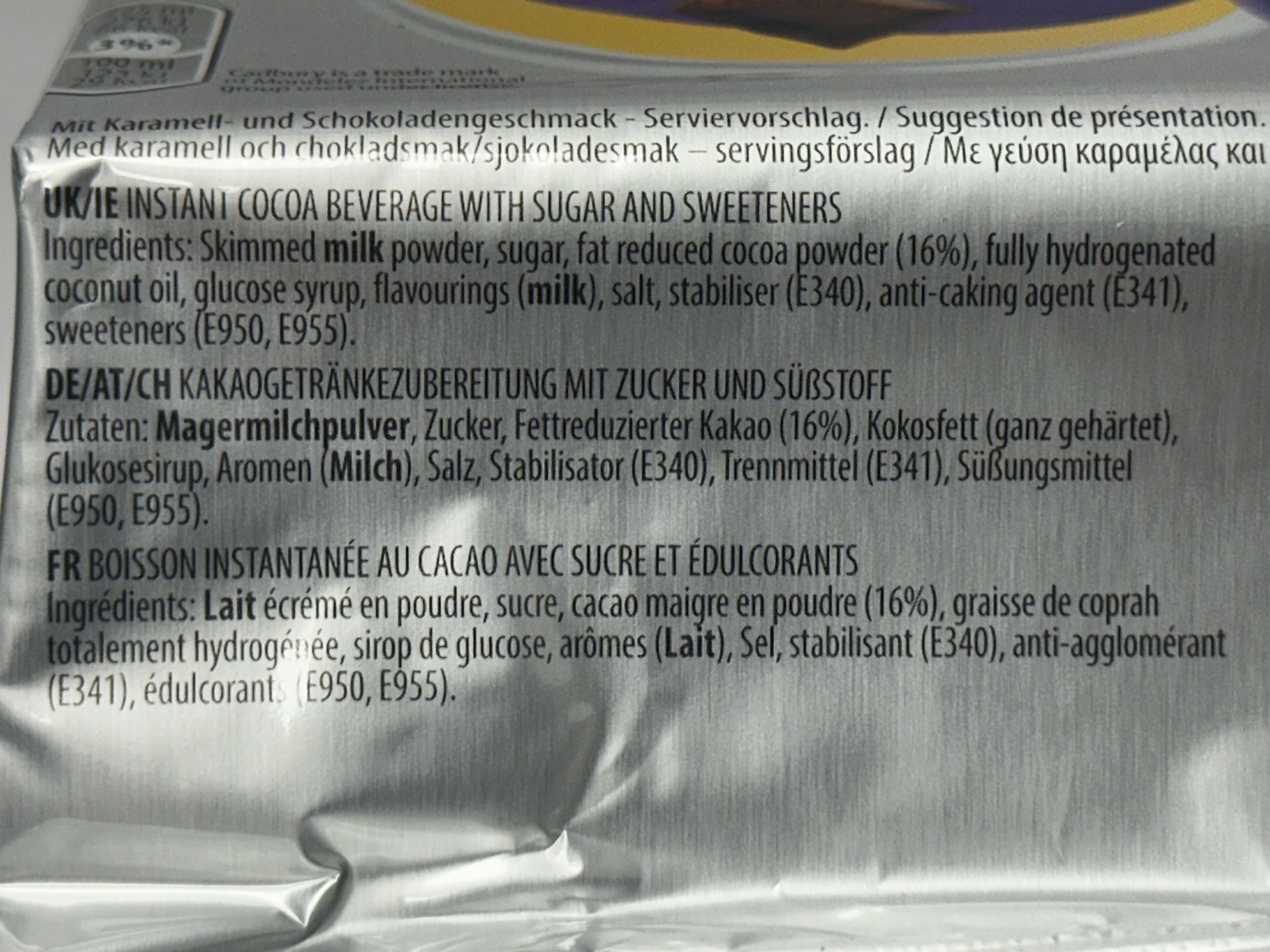 Skimmed milk powder, sugar, fat reduced cocoa powder (16%), fully hydrogenated coconut oil, glucose syrup, flavourings (milk), salt, stabiliser (E340), anti-caking agent (E341), sweeteners (E950, E955).