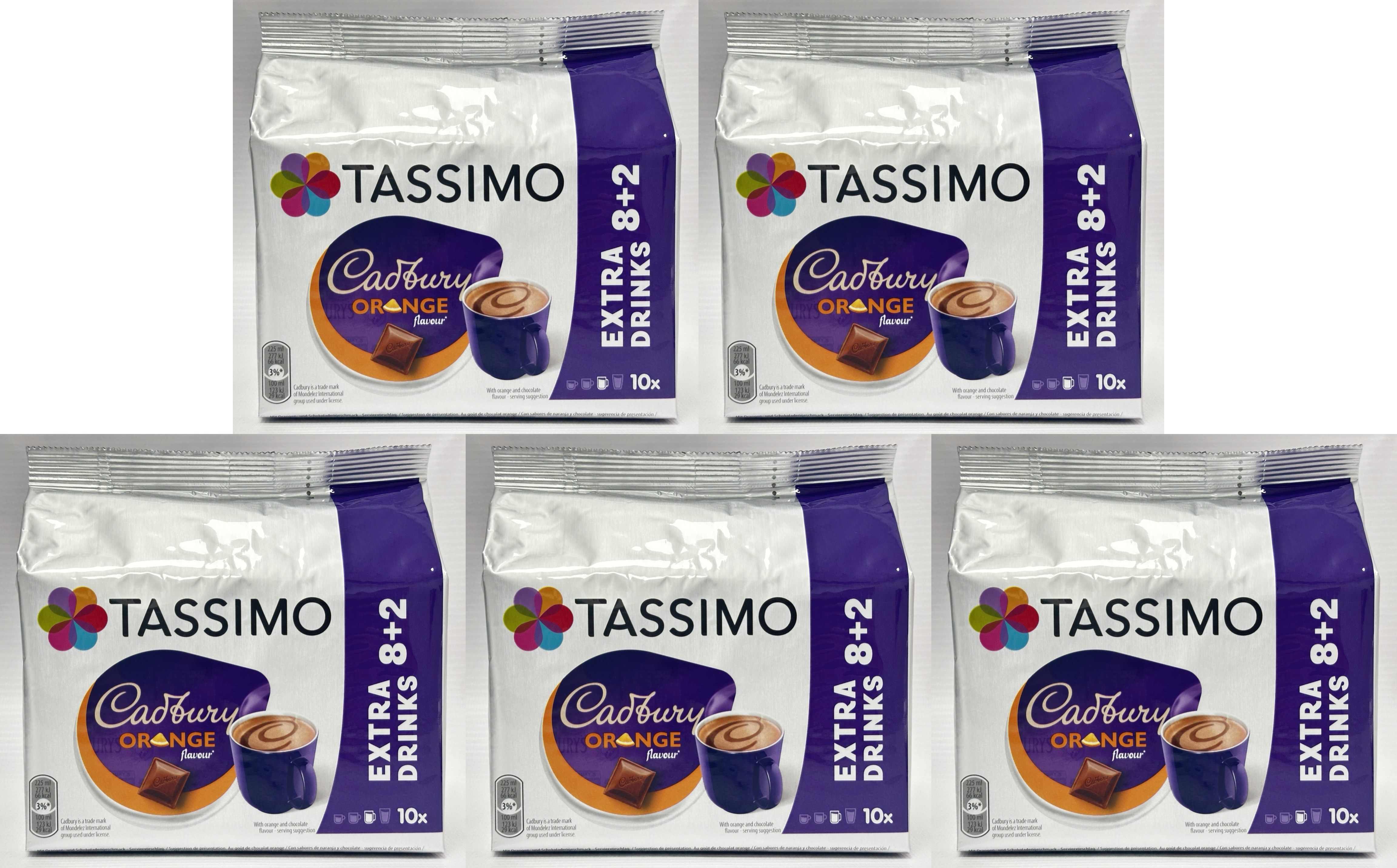 Tassimo Cadbury Orange Hot Chocolate Pods are a smooth instant cocoa beverage with sugar and sweeteners, designed for Tassimo machines. This bulk buy listing includes 5 packs of 10 pods, giving you 50 servings in total, making it ideal for family hot drinks cupboards, office kitchens and regular hot chocolate drinkers.