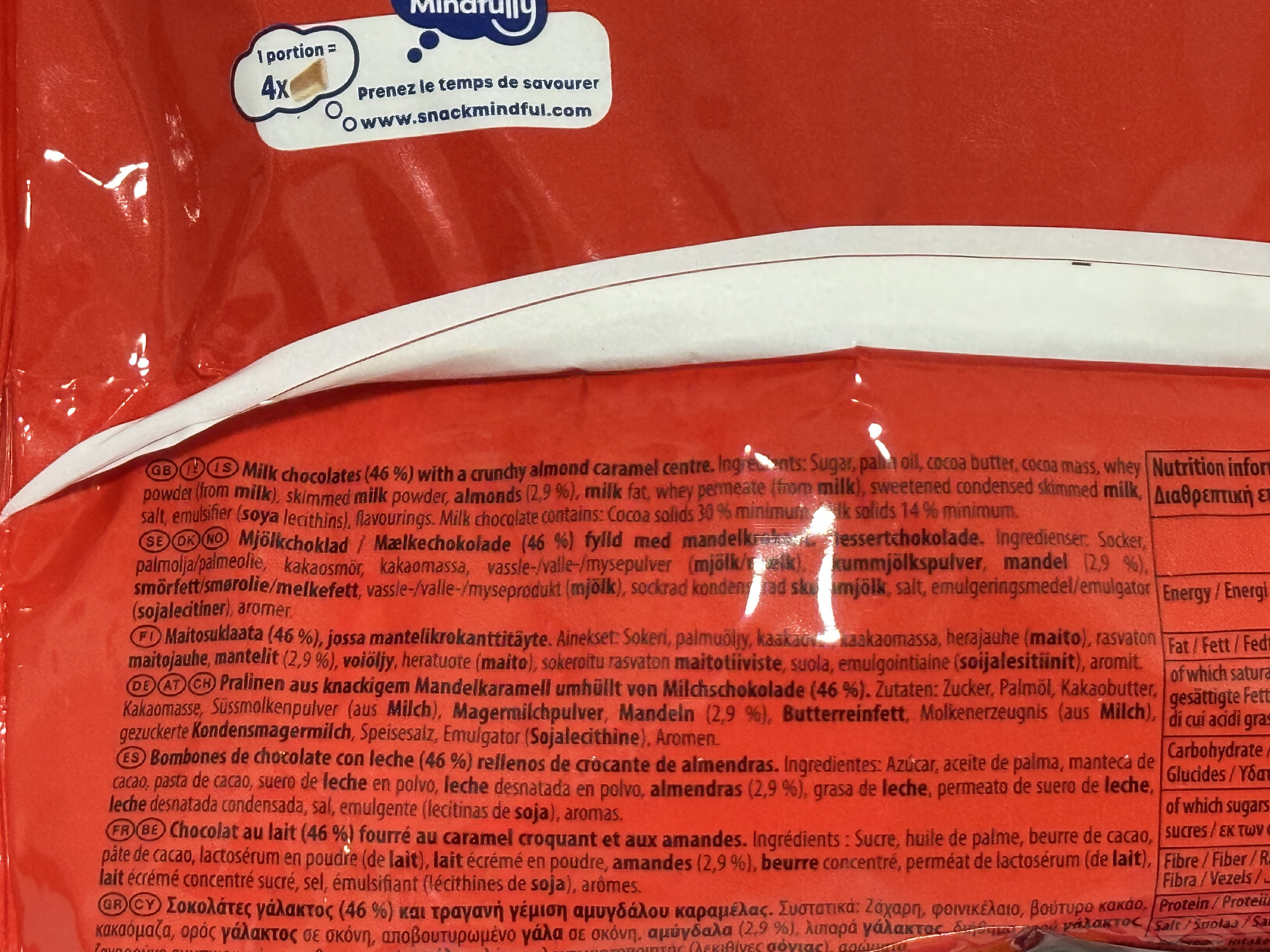 Milk chocolate (46%) with crunchy almond caramel centre. Ingredients: Sugar, palm oil, cocoa butter, cocoa mass, whey powder (from milk), skimmed milk powder, almonds (2.9%), milk fat, whey permeate (from milk), sweetened condensed milk, salt, emulsifier (soya lecithin), flavourings.