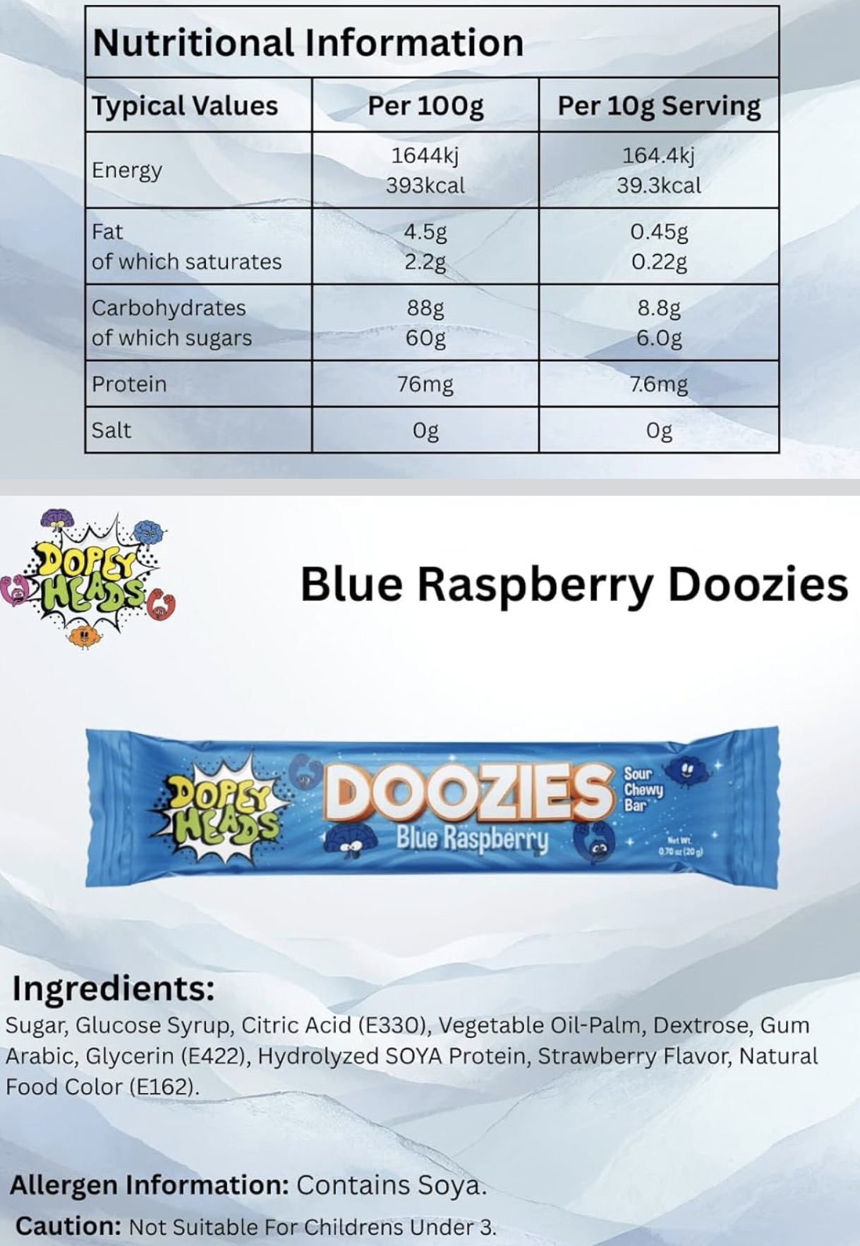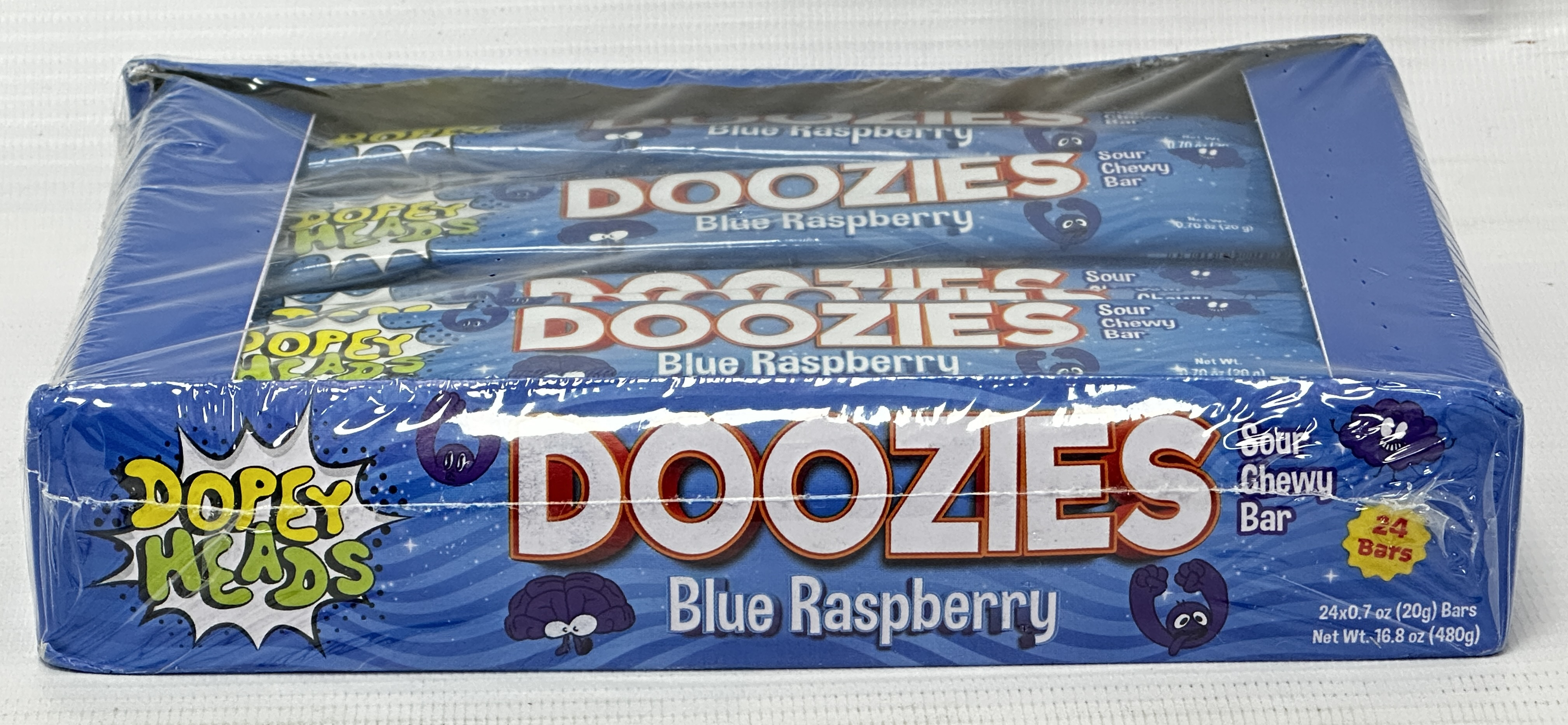 Dopey Heads Doozies Blue Raspberry Sour Chewy and Stretchy Bars 24 x 20g