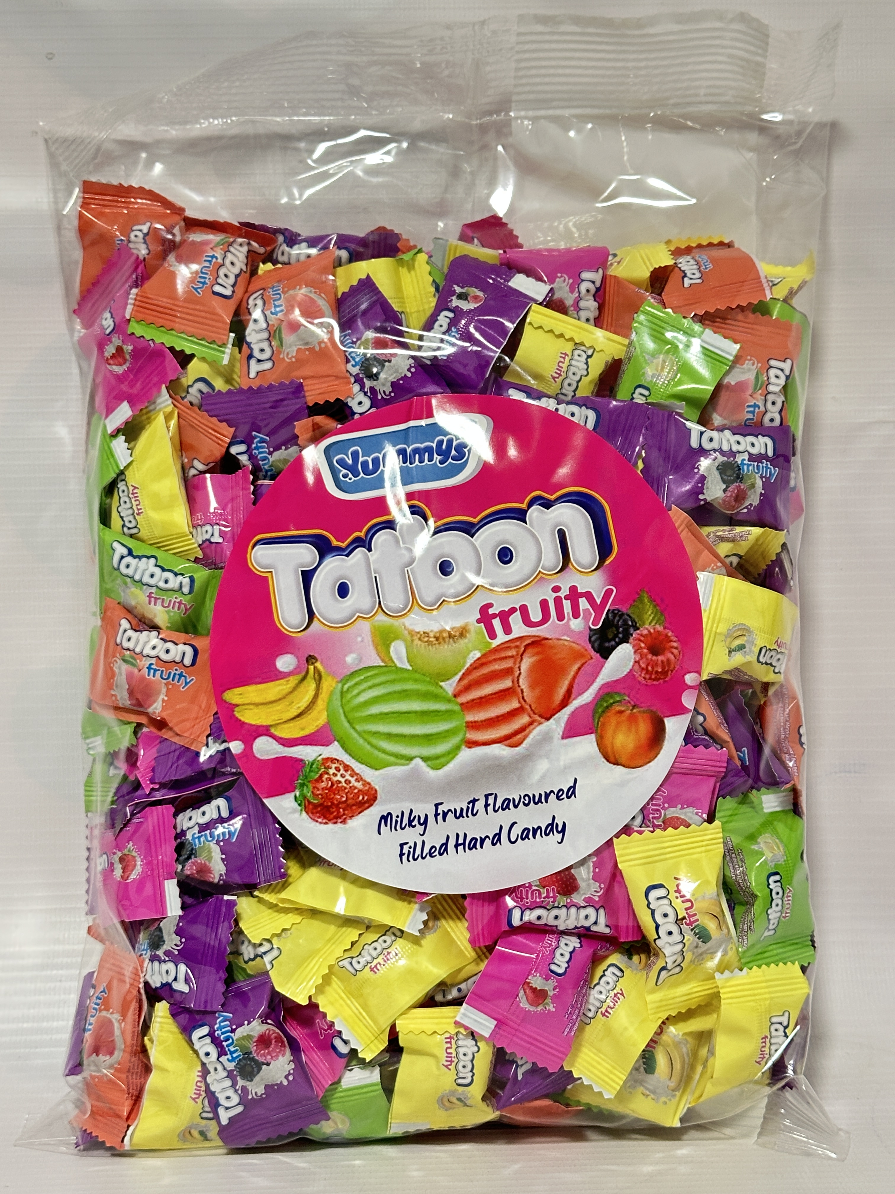 Enjoy a vibrant mix of fruity, creamy hard candies with Tatbon Fruity Hard Candy – a 1kg bulk bag packed with colourful, individually wrapped sweets in delicious assorted flavours. Each candy is filled with a soft milky centre for a unique combination of fruity and creamy taste in every bite.