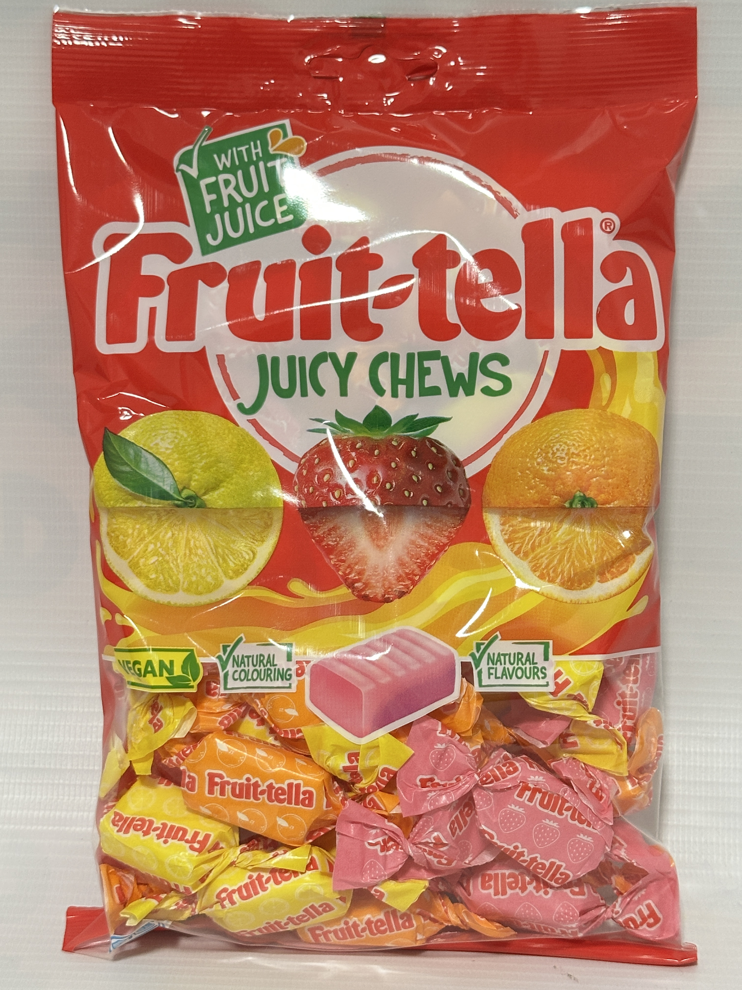 Enjoy the fruity taste of Fruit-tella Juicy Chews, made with real fruit juice and packed with delicious strawberry, orange and lemon flavours. These soft chewy sweets are vegan-friendly, use natural colourings and flavours, and come in a generous 300g sharing bag. Perfect for parties, treat bowls, lunchboxes and on-the-go snacking, Fruit-tella Juicy Chews deliver a juicy burst of flavour in every bite.