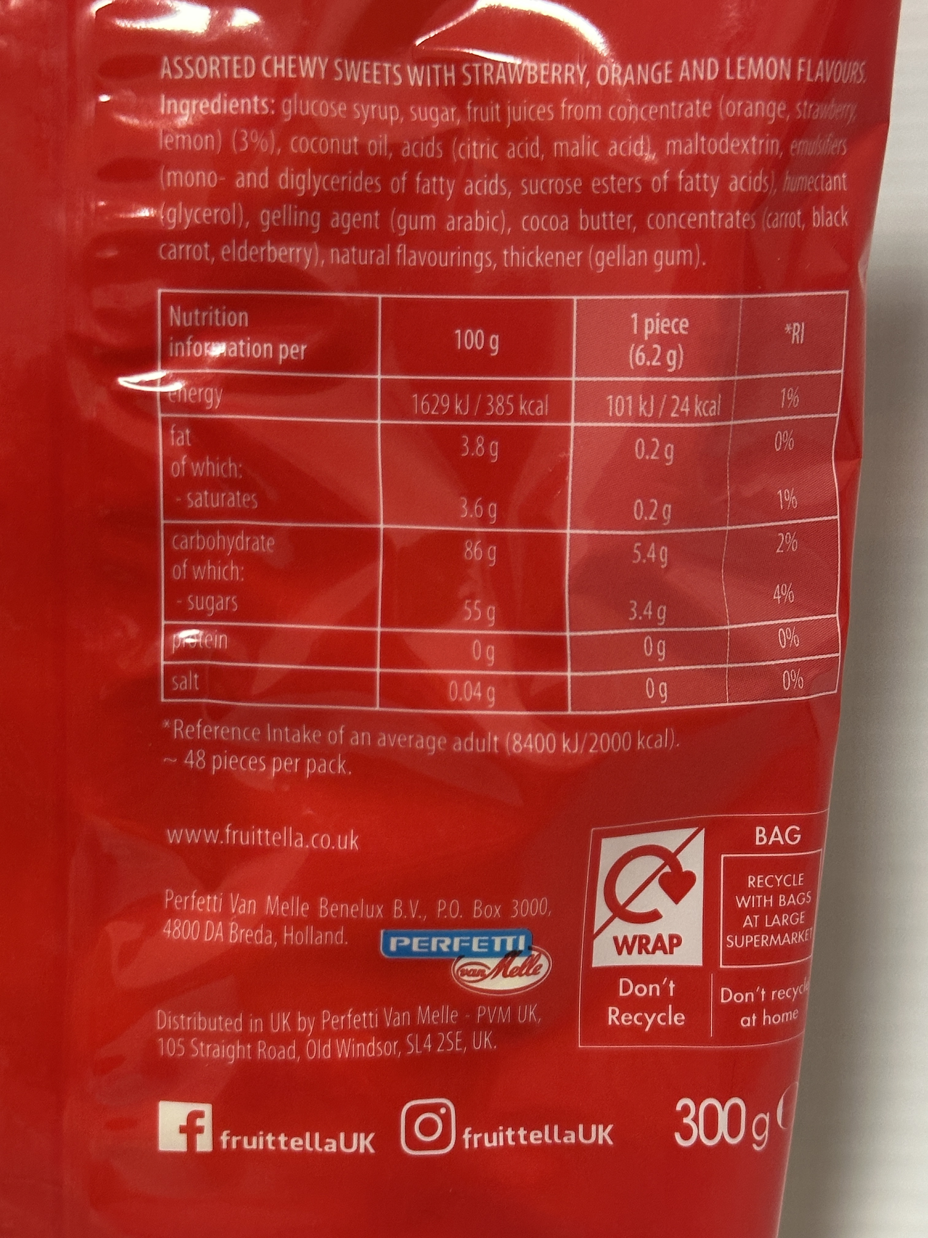 Glucose syrup, sugar, fruit juices from concentrate (orange, strawberry, lemon) (3%), coconut oil, acids (citric acid, malic acid), maltodextrin, emulsifiers (mono- and diglycerides of fatty acids, sucrose esters of fatty acids), humectant (glycerol), gelling agent (gum arabic), cocoa butter, concentrates (carrot, black carrot, elderberry), natural flavourings, thickener (gellan gum).