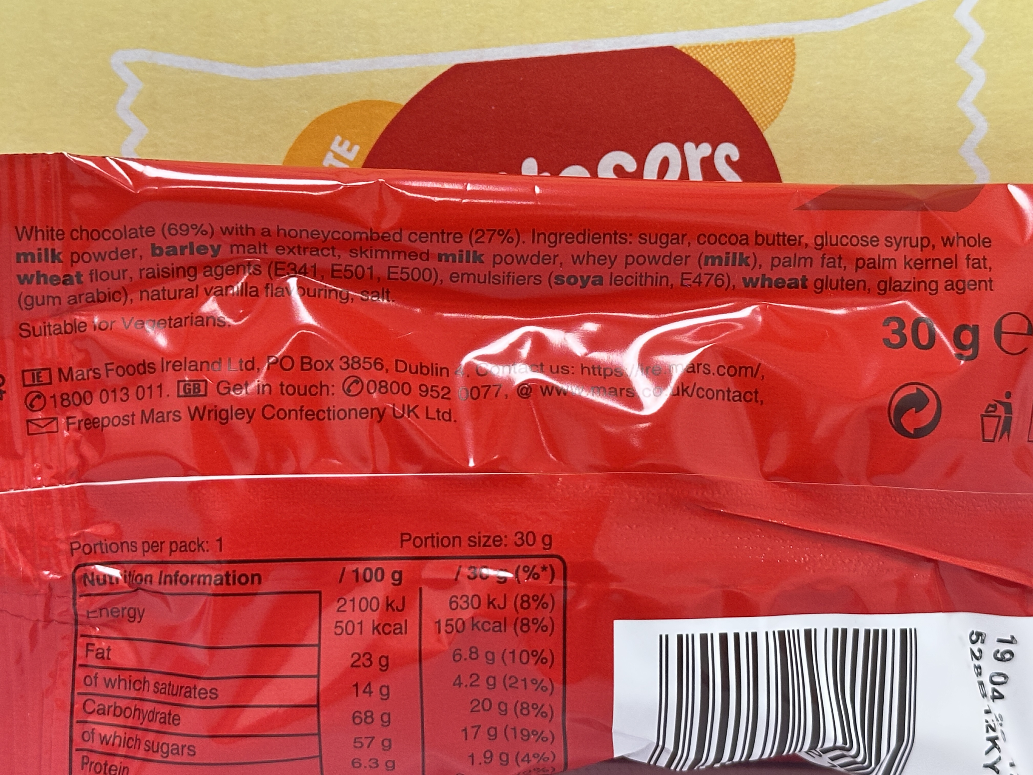 White chocolate (69%) with a honeycombed centre (27%). Ingredients: sugar, cocoa butter, glucose syrup, whole milk powder, barley malt extract, skimmed milk powder, whey powder (milk), palm fat, palm kernel fat, wheat flour, raising agents (E341, E501, E500), emulsifiers (soya lecithin, E476), wheat gluten, glazing agent (gum arabic), natural vanilla flavouring, salt.