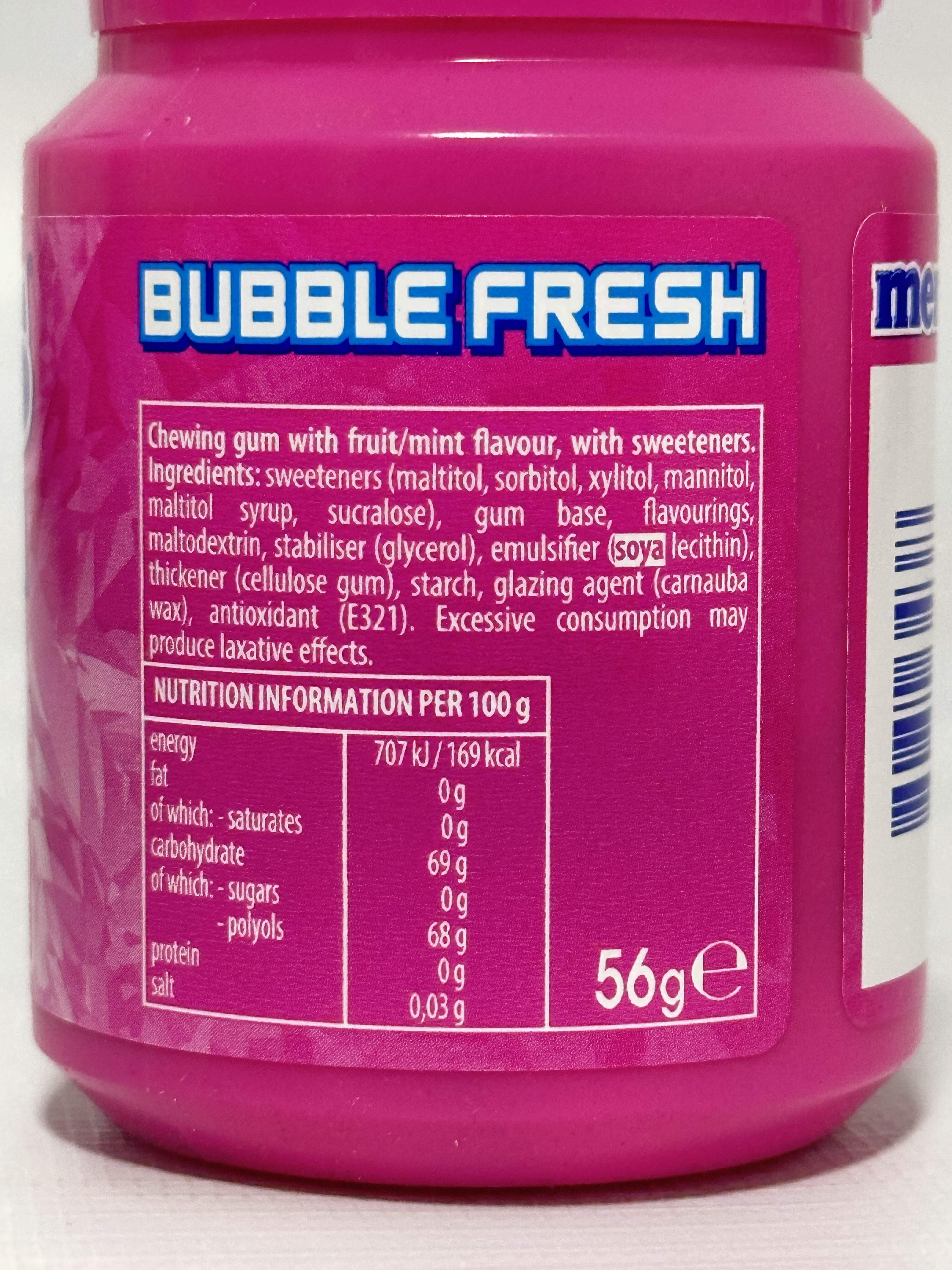 Sweeteners (maltitol, sorbitol, xylitol, mannitol, maltitol syrup, sucralose), gum base, flavourings, maltodextrin, stabiliser (glycerol), emulsifier (soya lecithin), thickener (cellulose gum), starch, glazing agent (carnauba wax), antioxidant (E321).