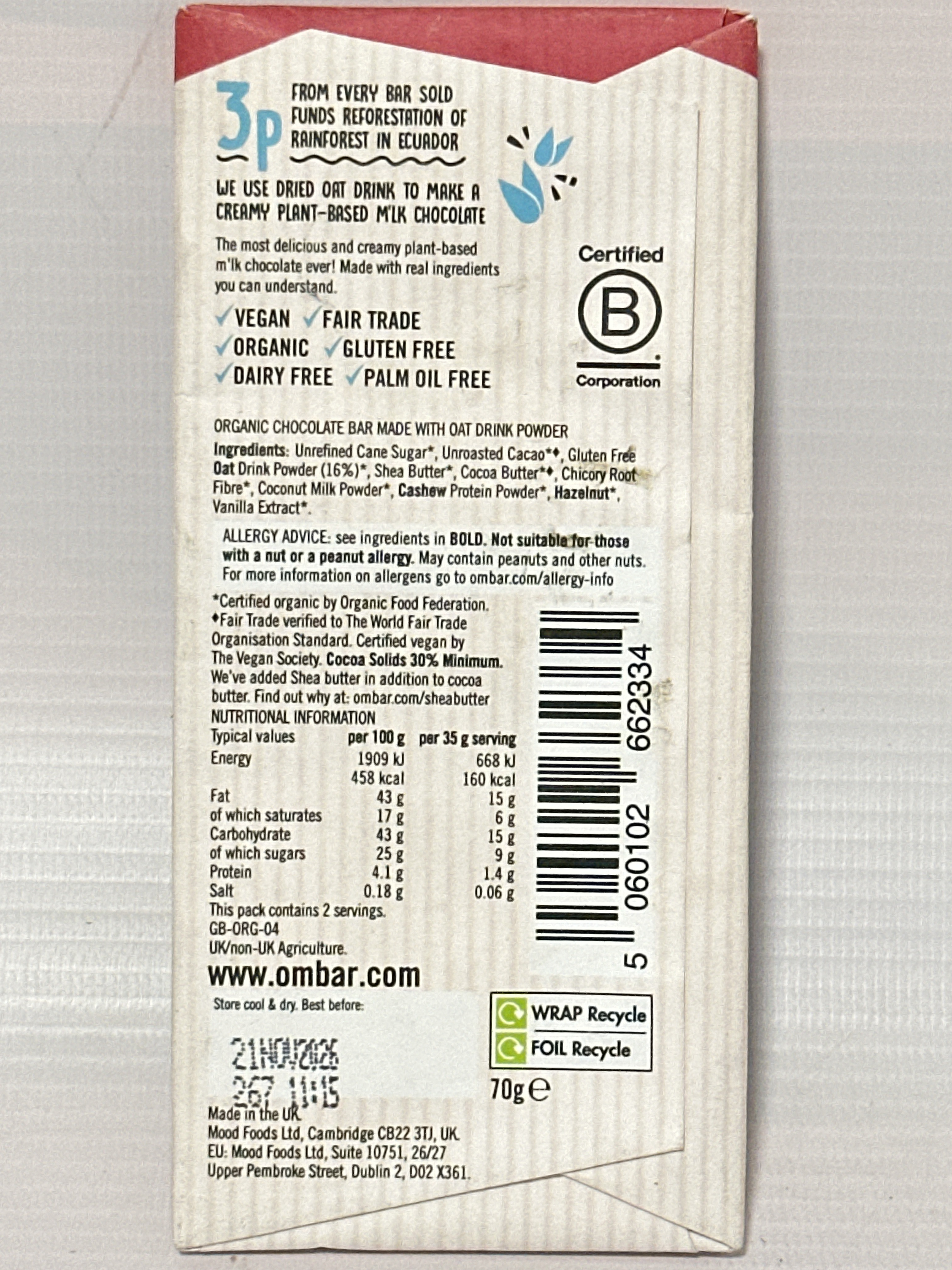Ombar Oat M’lk Vegan Chocolate Bar 70g