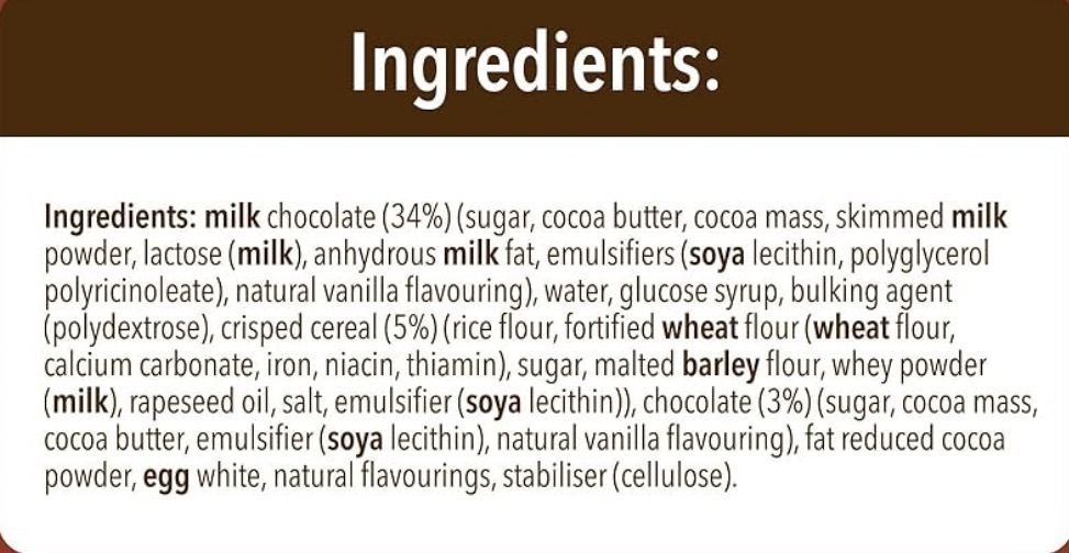 Ingredients: Milk chocolate (34%) [sugar, cocoa butter, cocoa mass, skimmed milk powder, lactose (milk), anhydrous milk fat, emulsifiers (soya lecithin, polyglycerol polyricinoleate), natural vanilla flavouring], water, glucose syrup, bulking agent (polydextrose), crisped cereal (5%) [rice flour, fortified wheat flour (wheat flour, calcium carbonate, iron, niacin, thiamin)], sugar, malted barley flour (gluten), whey powder (from milk), rapeseed oil, salt, emulsifier (soya lecithin), chocolate (3%) [sugar, cocoa mass, cocoa butter, emulsifier (soya lecithin), natural vanilla flavouring], fat-reduced cocoa powder, egg white, natural flavourings, stabiliser (cellulose).