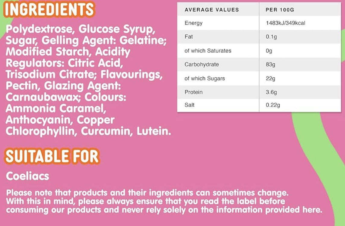 Polydextrose, glucose syrup, sugar, gelling agent: gelatine; modified starch, acidity regulators: citric acid, trisodium citrate; flavourings, pectin, glazing agent: carnauba wax; colours: ammonia caramel, anthocyanin, copper chlorophyllin, curcumin, lutein.