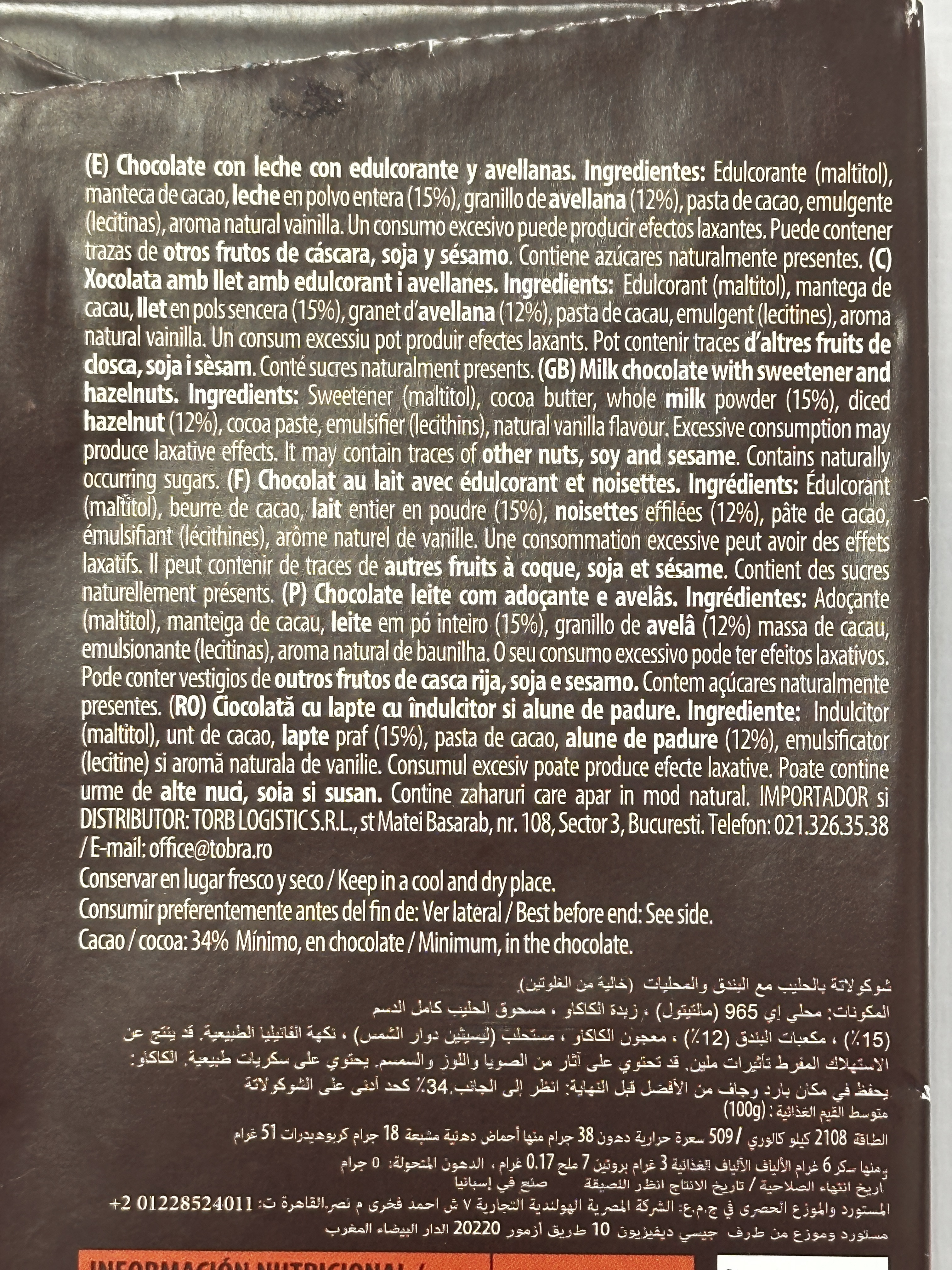 Sweetener (maltitol), cocoa butter, whole milk powder (15%), diced hazelnut (12%), cocoa paste, emulsifier (lecithins), natural vanilla flavour.