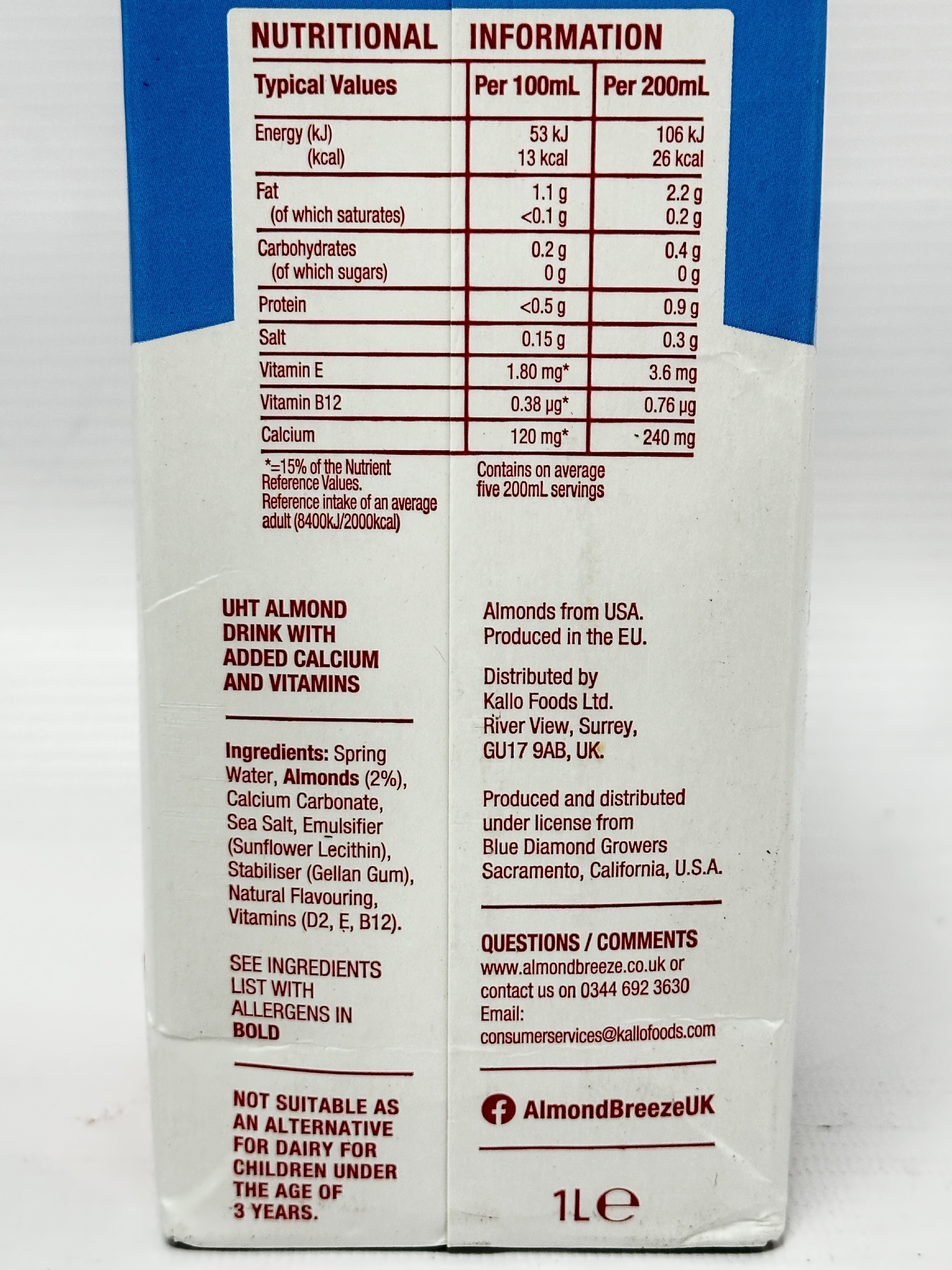 - UHT almond drink with added calcium and vitamins