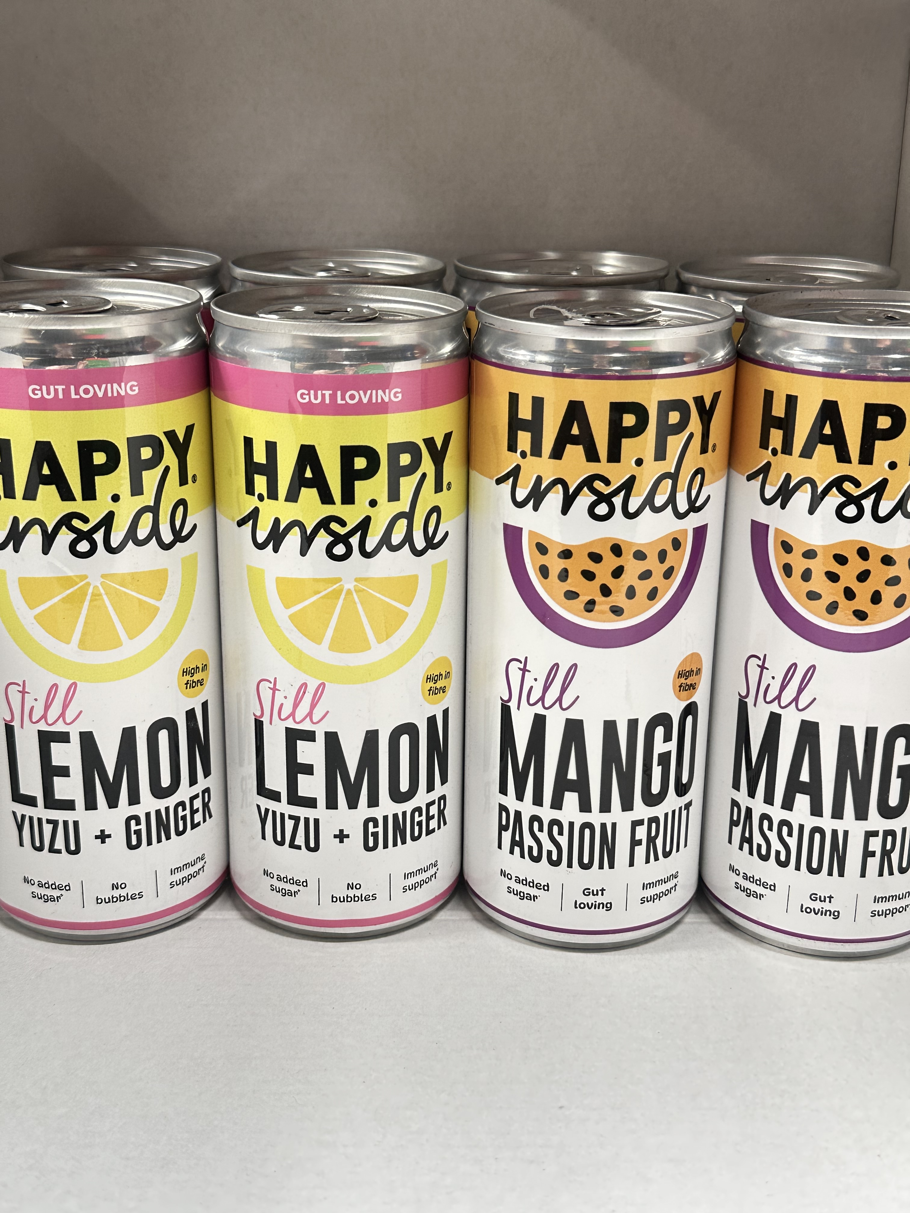 Happy Inside 8 X 250ml Gut Loving Cans 4 X Lemon & Yuzu Ginger 4 X Mango Passion Fruit