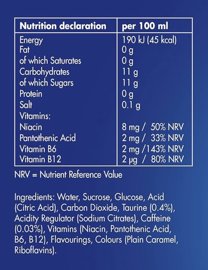 Water, Sucrose, Glucose, Acid (Citric Acid), Carbon Dioxide, Taurine (0.4%), Acidity Regulator (Sodium Citrates), Caffeine (0.03%), Vitamins (Niacin, Pantothenic Acid, B6, B12), Flavourings, Colours (Plain Caramel, Riboflavins).