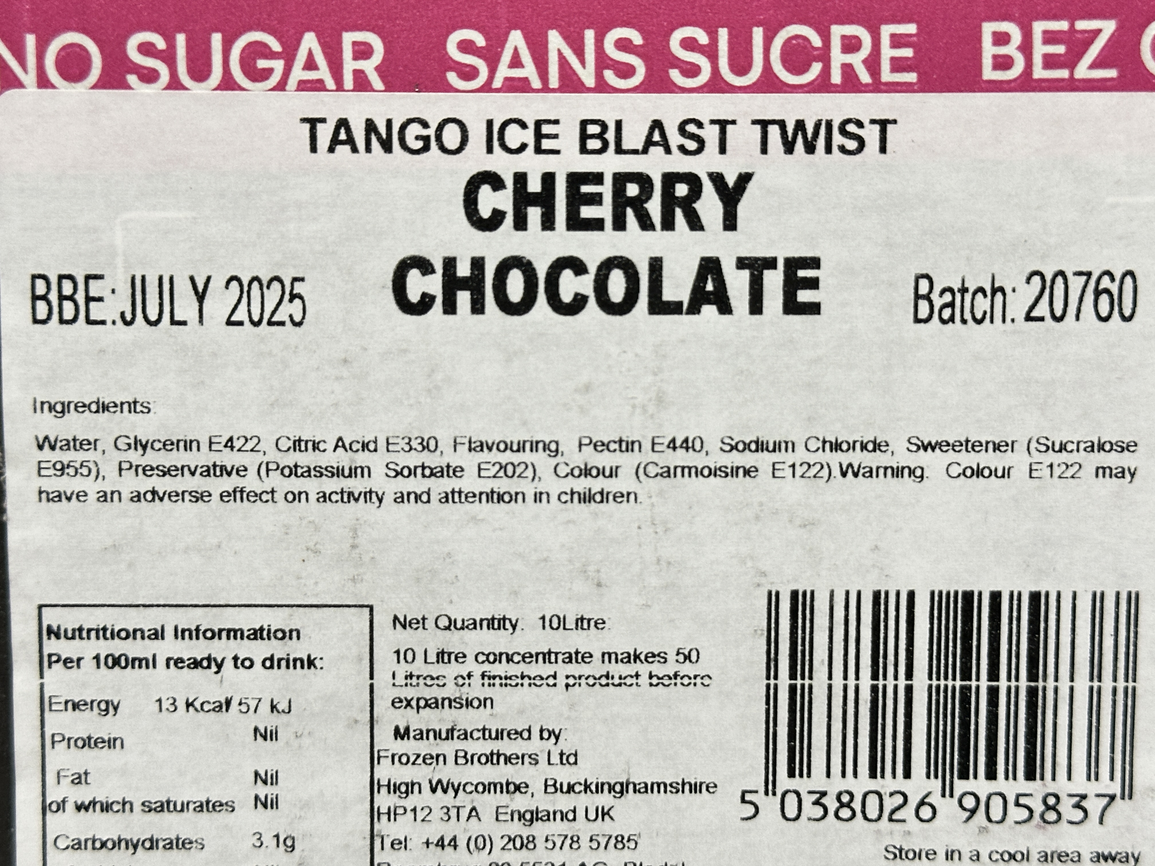 Enjoy the ultimate frozen fizzy drink experience with Tango Ice Blast Twist in a bold Cherry Chocolate flavour. Designed for slush machines and frozen drinks dispensers, this 10-litre post-mix syrup offers a sugar-free formula, delivering a delicious twist on the classic Tango taste with none of the sugar.